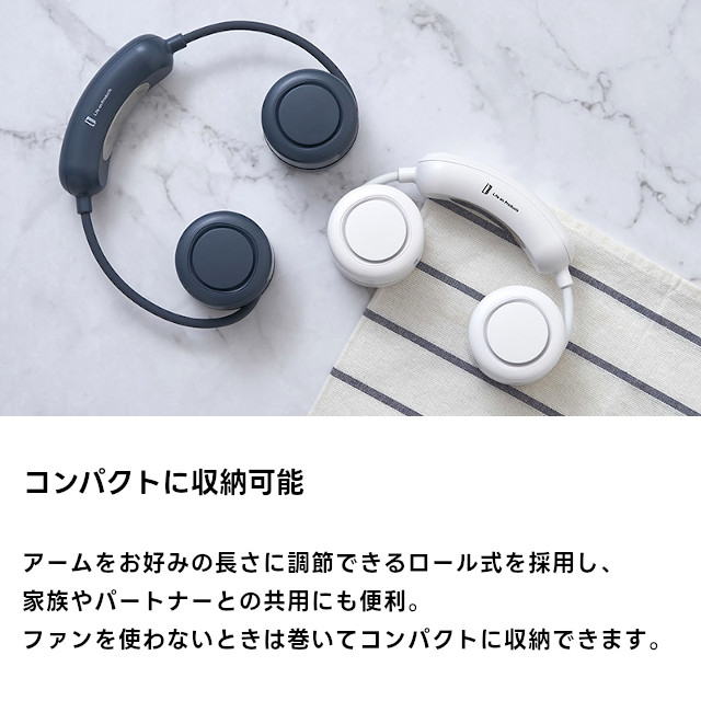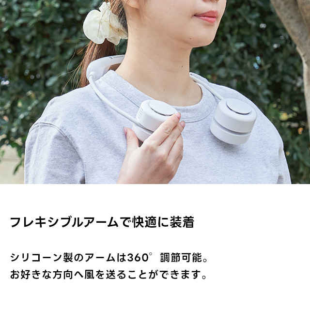 ファン部分には角度を自由に調節できるシリコーン製アームを採用し、欲しい箇所にしっかり送風。アームはロール式のため、 使わないときはコンパクトに収納できます。