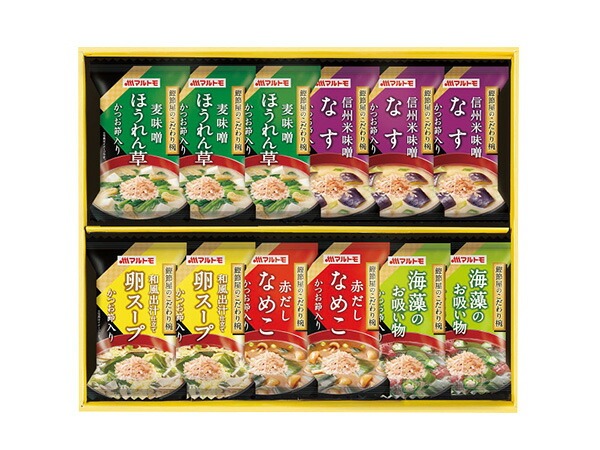 マルトモ 鰹節屋のこだわり椀 12食 なすの味噌汁 ほうれん草の味噌汁 なめこの味噌汁 卵スープ 海藻のお吸い物 MS-20F 化粧箱入 税率8%