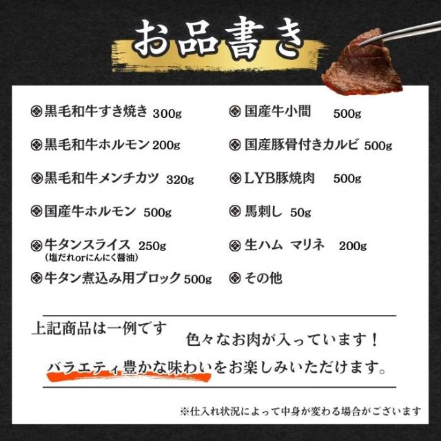 ●5品以上の焼肉、原料肉、加工肉等々バラエティーに富んだ商品を詰合せ致します。