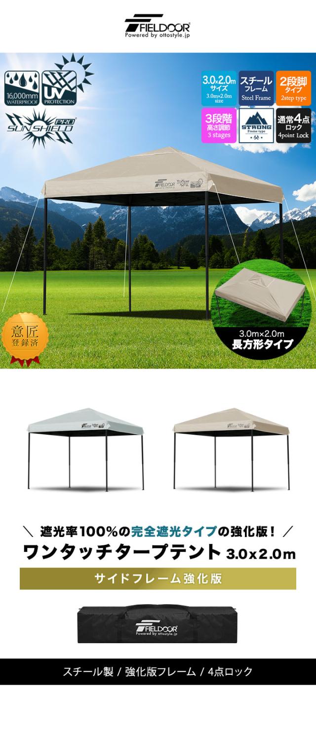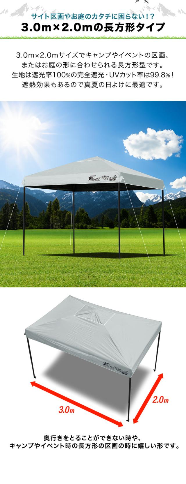 FIELDOOR ワンタッチタープテント 3m×2m 長方形 横長 スチール 強化フレーム 遮光 遮熱 UVカット テント タープ 日よけ 送料無料