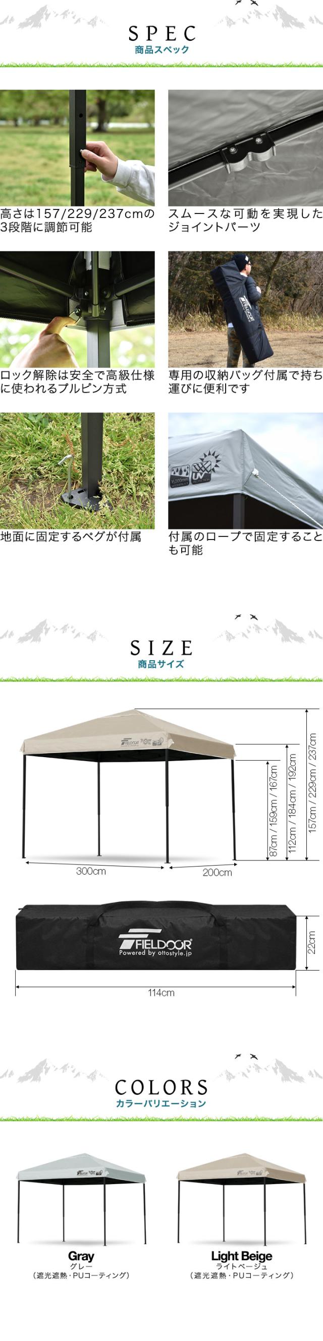 | サイズ: 組立時 : (約)3.0m×2.0m×1.57m / 2.29m / 2.37m 収納時 : (約)22cm×22cm×114cm |