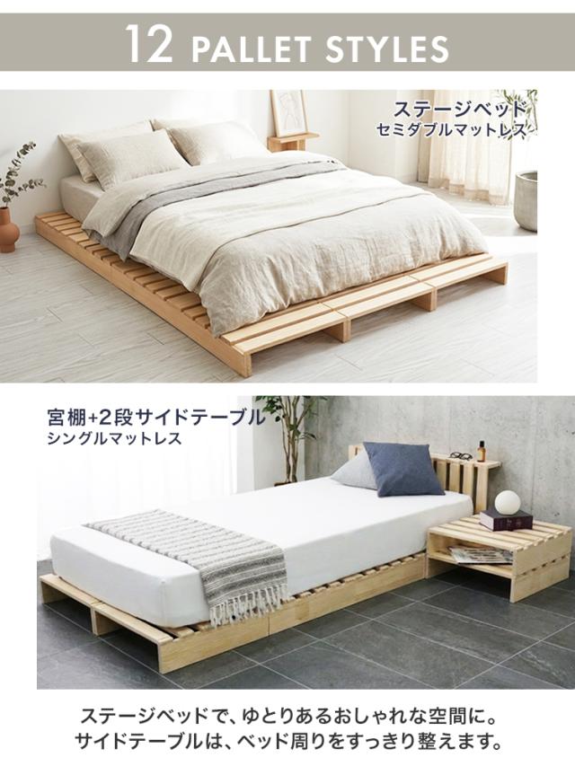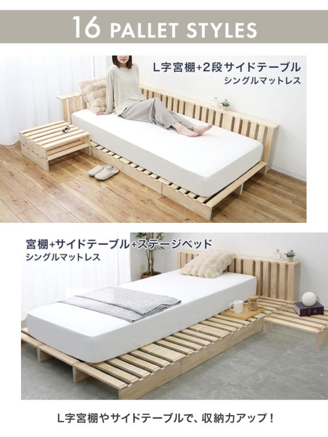 パレット構造だから、シングル・ダブル・キングサイズなどお好みのサイズにアレンジしたり、 宮棚を作ったり、自由に組み合わせて使えます。