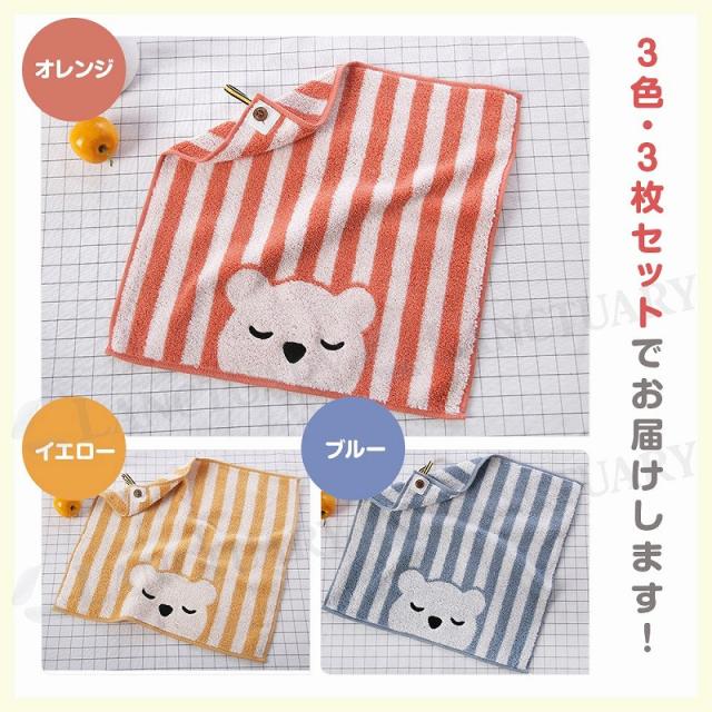 温かみのあるオレンジ、明るく元気なイエロー、爽やかなブルー。3色のストライプ柄が特徴的なループ付きタオルのセット。クマのモチーフが施されたデザインは、子どもたちに大人気です。