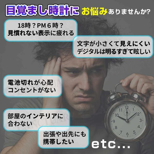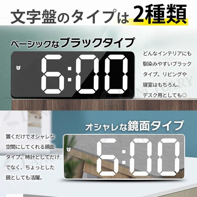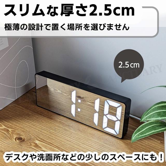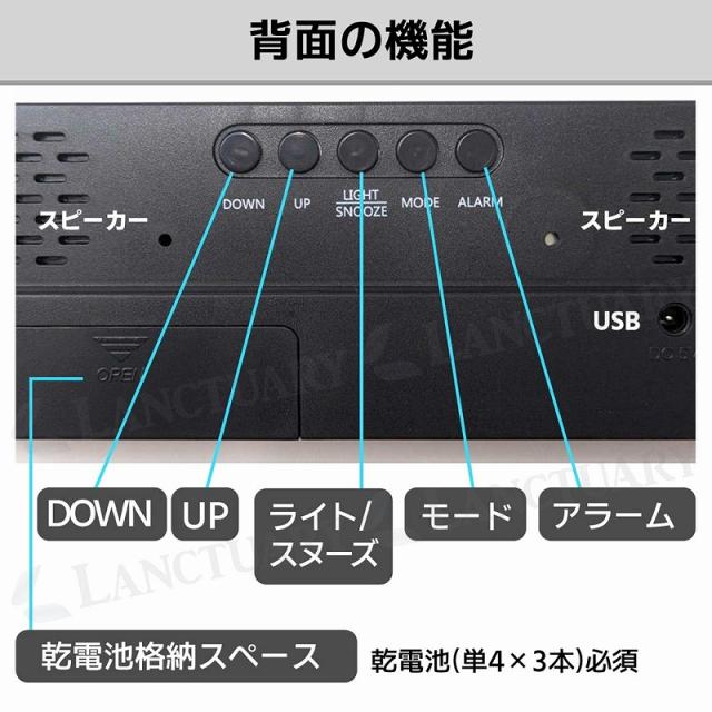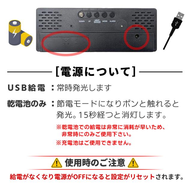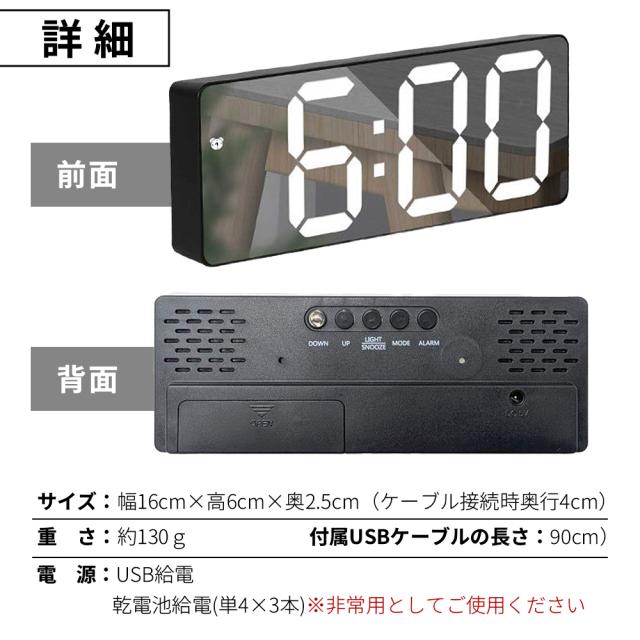 | 商品の説明 | 電池切れが心配、コンセントがない、部屋のインテリアに合わない、置く場所がない、出張や出先にも携帯したいなど こんな目覚まし時計に悩みはありませんか? 【大きく見やすい】インテリアにも馴染む、シンプルデザイン。明るい場所でもLEDで発光!視認性が高く見えやすい◎ 【鏡面タイプ2種類】インテリアとしてもおしゃれで鏡を見たいときにも便利です。 【静音設計】アラーム以外の機械音は鳴りません。小さいお子さんの眠りなど妨げません。 【多機能なモード】便利で多機能なモードの表示切り替えができます。アラームモード、時間モード、温度モード、日付モード※時間モードは、24時間表記とAM/PM表記の切り替えができます。 【スリムな厚さ2.5cm】極薄の設計で置く場所を選びません。携帯しやすくデスクや洗面所などの少しのスペースにも! 【背面の機能一覧】DOWN、UP、ライト/スヌーズ、モード、アラーム、乾電池格納スペース 【電源について】 USB給電→常時発光(給電のため、USBケーブルを外すとすべての設定がリセットされます) 乾電池のみ →節電モードになりポンと触れると15秒間発光します。 【乾電池での使用は緊急時のみで、usb電源での使用をおすすめしております。】 |