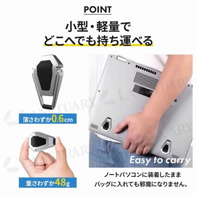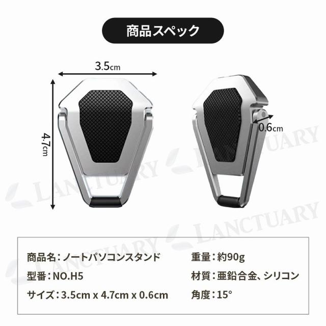 | 主な仕様 | 商品名:ノートパソコンスタンド サイズ:3.5cm x 4.7cm x 0.6cm 重量:約90g 材質:亜鉛合金、シリコン 角度:15° |