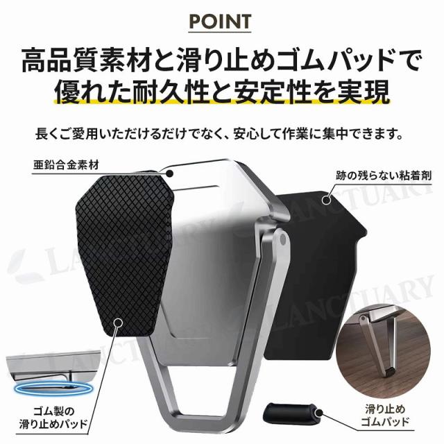 | 商品の説明 | 近年、リモートワークやフリーランスなど、 場所を選ばずに仕事をする人が増えています。 カフェやコワーキングスペースなど、 自宅以外の場所でノートパソコンを使う機会も 増えているのではないでしょうか。 しかし、長時間ノートパソコンを使用すると、 姿勢が悪くなりがちです。 猫背になったり、首や肩が凝ったりするなど、 体の不調を感じる人もいるでしょう。 また、ノートパソコンの熱がこもり、 動作が遅くなることもあります。 これらの問題を解決するのが、 ノートパソコンスタンドです。 ノートパソコンスタンドを使用することで、 目線が上がり、正しい姿勢を保つことができます。 猫背や首・肩の凝りを防止し、 快適に作業できるでしょう。 また、ノートパソコンの底面が持ち上がり、 放熱効果も期待できます。 ノートパソコンの熱暴走を防ぎ、 動作速度の低下を防ぐことができるでしょう。 このノートパソコンスタンドは、 薄さわずか0.6cmと超薄型でありながら、 耐久性に優れた亜鉛合金素材を使用しています。 15度の黄金角度に設計されており、 常に最適な高さで使用できます。 滑り止めゴムパッド付きで、 安定性も抜群です。 強力な粘着テープで、 ノートパソコンにしっかりと固定できます。 剥がした跡も残りにくいので、 安心してお使いください。 |