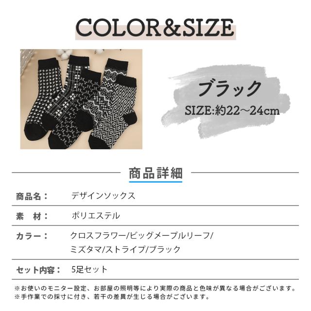 | 主な仕様 | 商品名:デザイン靴下 デザインソックス5足組 カラー:ブラック ストライプ ミズタマ ビッグメープルリーフ クロスフラワー サイズ:22cm-24cm 素材:ポリエステル |