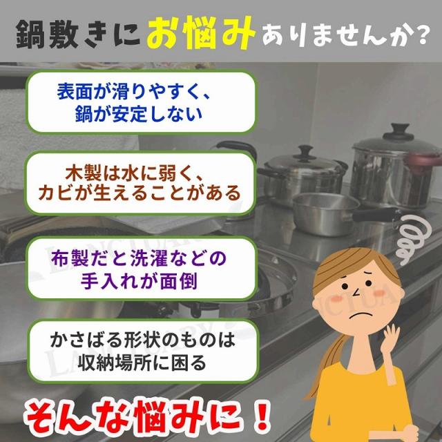 表面が滑りやすく鍋が安定しない、木製は水に弱くカビが生えることがある、布製だと洗濯などの手入れが面倒、かさばる形状のものは収納場所に困る、などの悩みに!