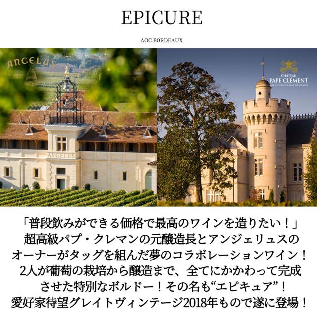 「普段飲みができる価格で最高のワインを造りたい!」 超高級パプ・クレマンの元醸造長とアンジェリュスのオーナーがタッグを組んだ夢のコラボレーションワイン!2人が葡萄の栽培から醸造まで、全てにかかわって完成 させた特別なボルドー!その名も“エピキュア”!愛好家待望グレイトヴィンテージ2018年もので遂に登場!