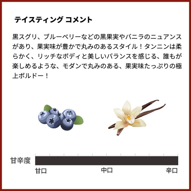 ![]() ■ぶどう品種:メルロー80%、カベルネ・ソーヴィニヨン20% ■発酵・熟成:フレンチオーク樽にて6ヶ月熟成 (300L、新樽比率20%) さらにステンレス製タンクで6か月の計12ヶ月熟成 今や時価数万円シャトー・パプ・クレマンの華麗な復興の道筋を立てた人物として注目される元醸造長ベルナール・プジョル氏と、これまた時価数万円、サンテミリオンの銘醸シャトー・アンジェリュスのオーナーであるユベール・ド・ブアール氏の夢のコラボレーション! 満を持してリリースした傑作ボルドー!サンテミリオンに似た岩盤層を持つ粘土石灰質土壌からの樹齢25年のメルロー80%にカベルネ・ソーヴィニヨン20%をこのクラスではびっくりのフレンチオーク樽にて6ヶ月熟成 (300L、新樽比率20%) さらにステンレス製タンクで6か月の計12ヶ月熟成で造られる究極フルボディ辛口赤ワイン! 黒スグリ、ブルーベリーなどの黒果実やバニラのニュアンスがあり、果実味が豊かで丸みのあるスタイル!タンニンは柔らかく、リッチなボディと美しいバランスを感じる、誰もが楽しめるような、モダンで丸みのある、果実味たっぷりの極上ボルドーがグレイトヴィンテージ[2018]年で限定少量入荷! |