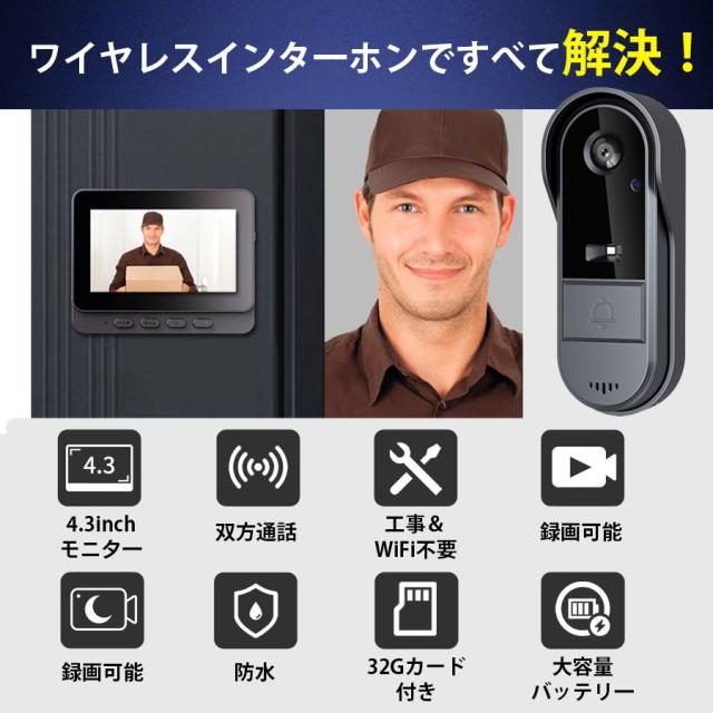 即納 インターホン 32Gカード付き テレビドアホン 録画機能 チャイム 工事不要 WIFI不要 USB充電 防犯 双方向通話 広角レン