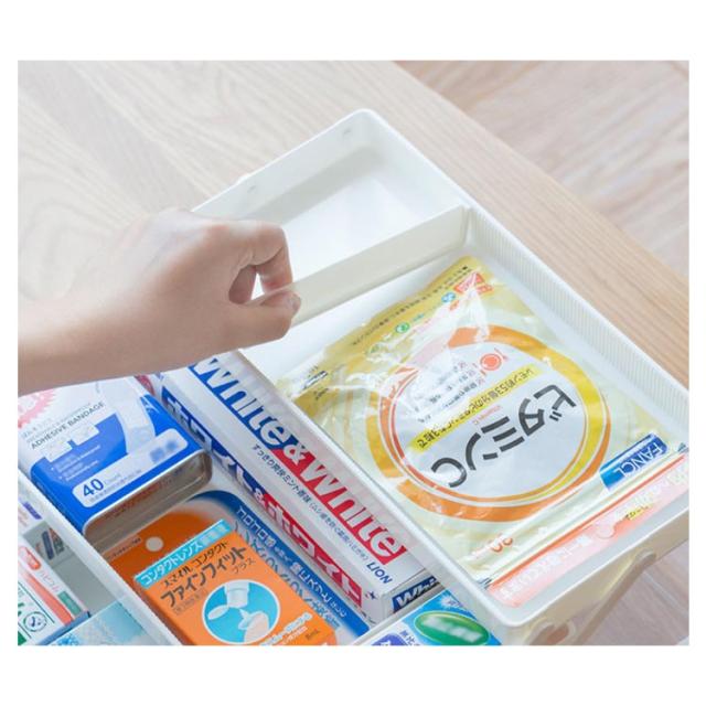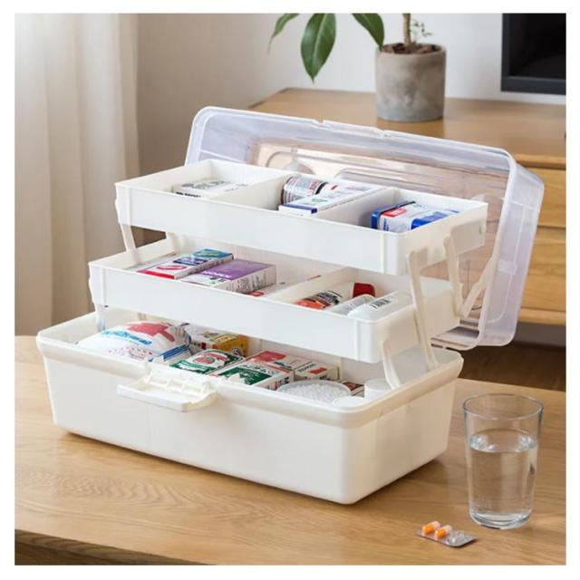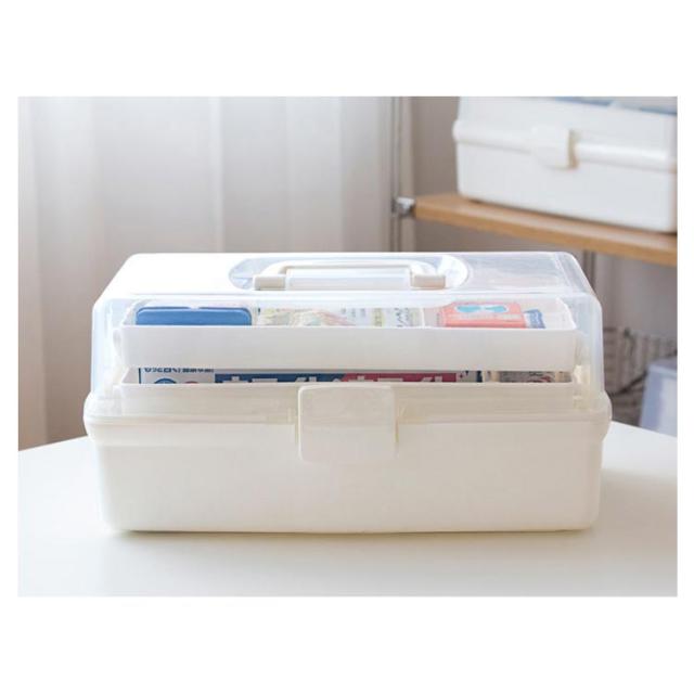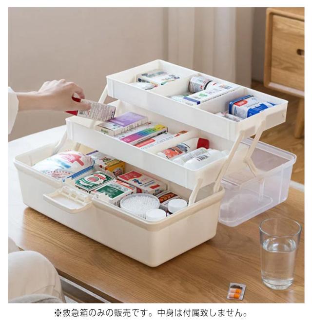 | 家庭用に、緊急時用に、アウトドア用に。三段式救急箱 常備薬等を普段からスッキリ収納できていると、いざという時にもさっと持ち運べるので、 万が一急な災害が起きた時でも、慌てることなく対応できます。 ※救急箱のみの販売です。中身は付属致しません。 | |