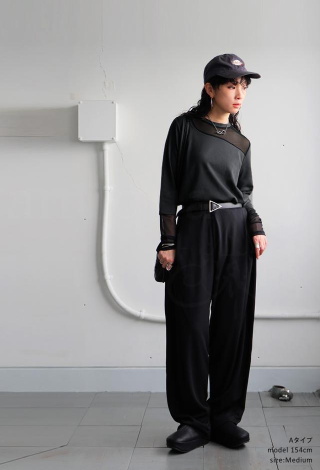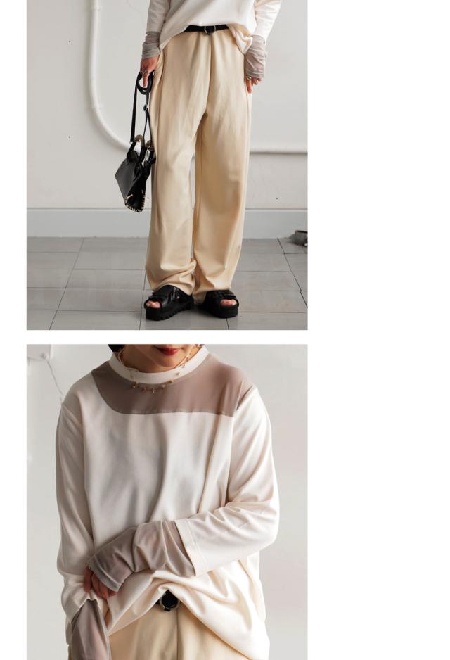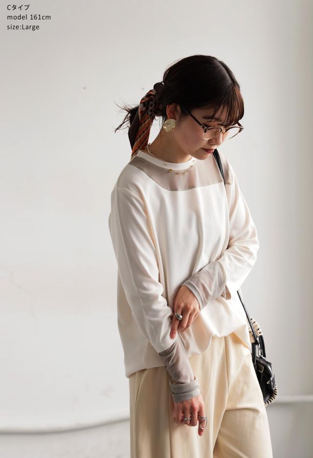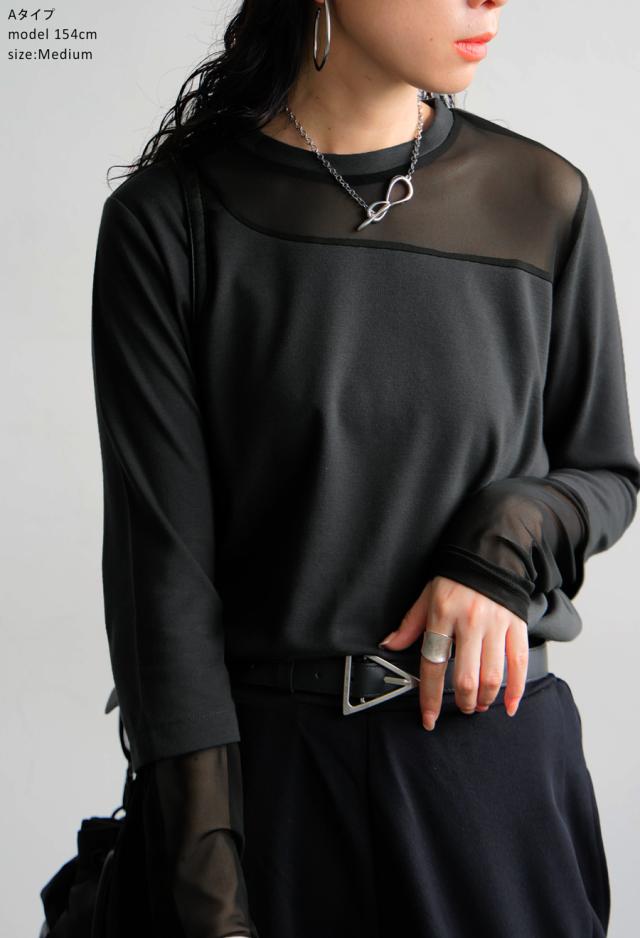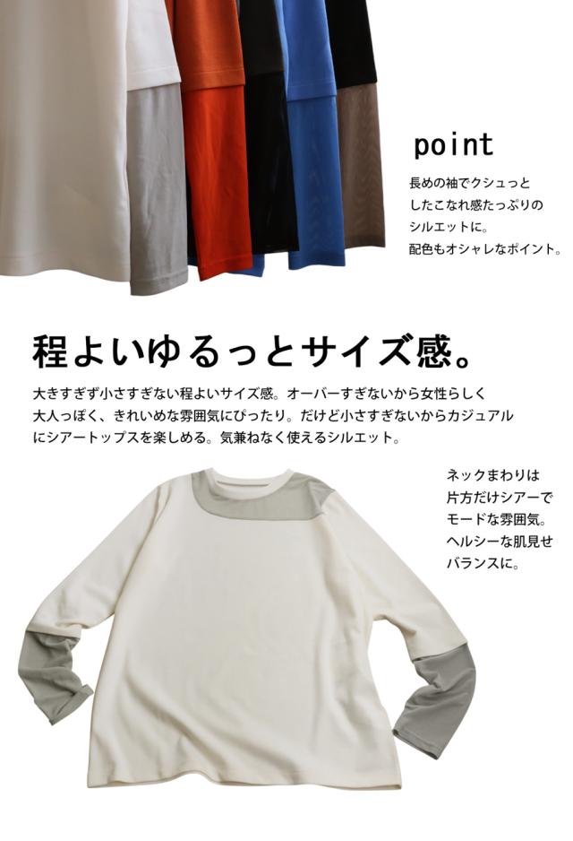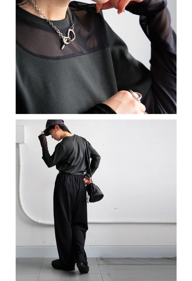 素材は肌ざわりの良いカットソー素材をベースに、シアー部分も柔らかくストレスフリーな着用感。