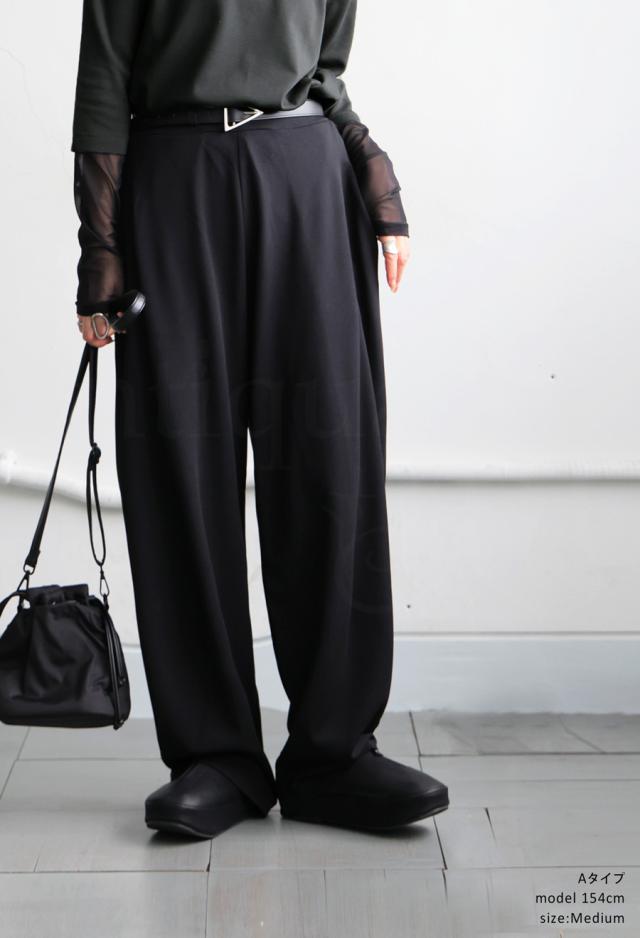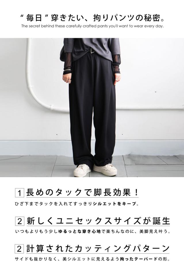 旬のルーズテーパードシルエットが美脚ラインを演出し、カジュアルからお出かけシーンまで幅広く対応可能。