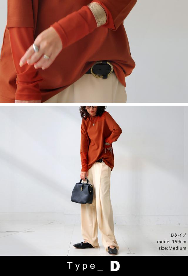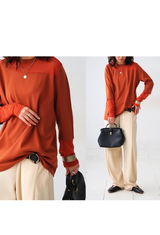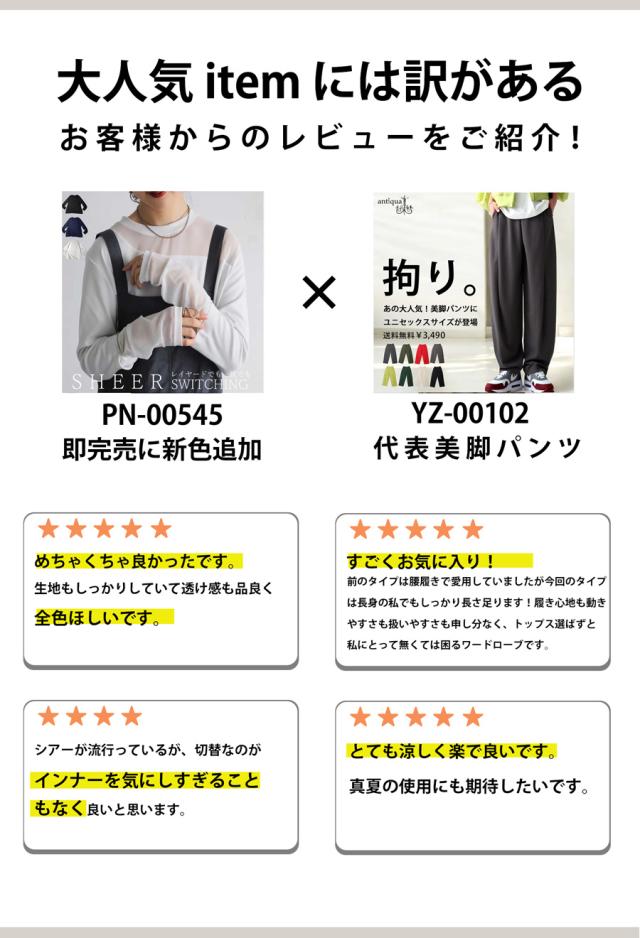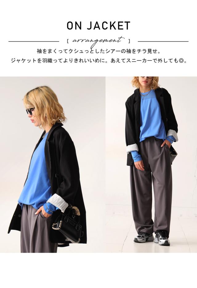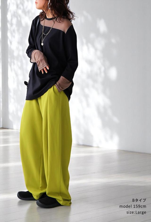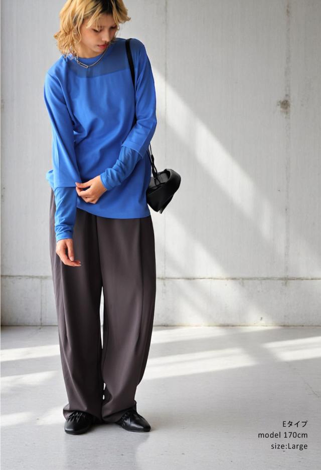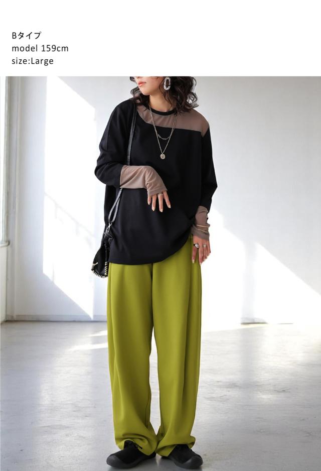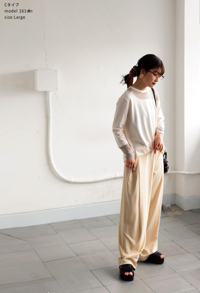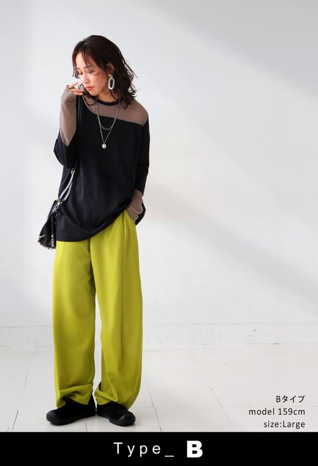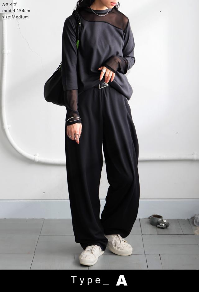 レイヤード風の絶妙な透け感トップスに、脚のラインを美しく魅せるルーズパンツを組み合わせた、今っぽさ満載の上下セットが新登場。