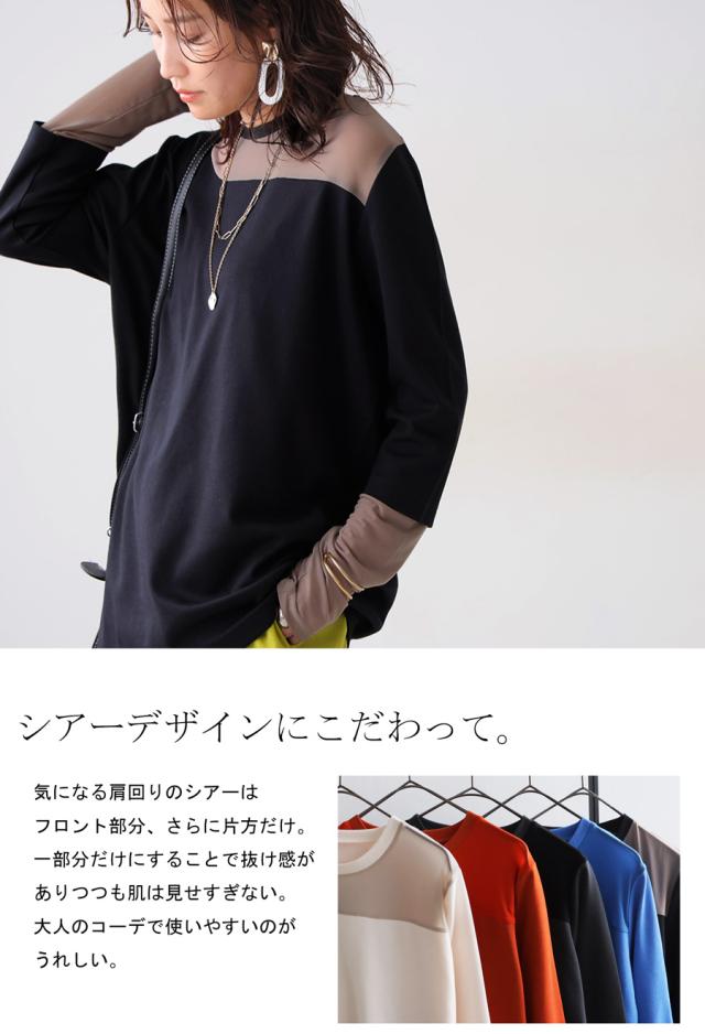 肩まわりや袖の一部に透け感のあるシアー切り替えを取り入れ、さりげない抜け感を演出。