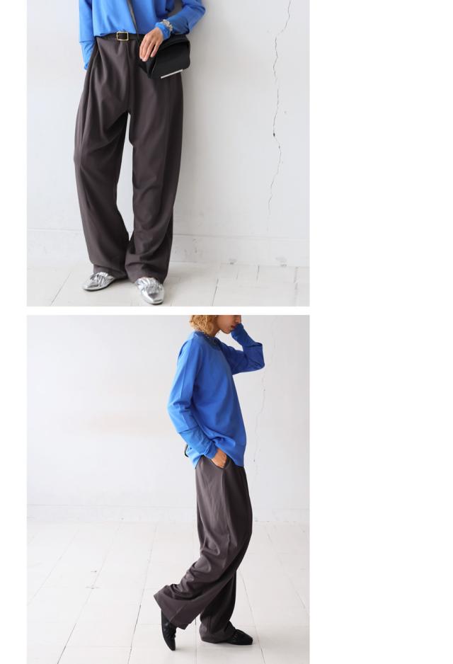 code-00044 洒落感と体型カバーを両立。シアートップス×美脚パンツの旬映えセットアップで、着るだけで完成する最旬コーデ。今季マストな一着。