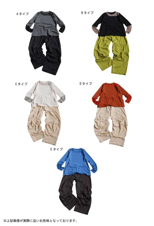 パンツは腰まわりを優しく包み込むウエストゴム仕様で、リラックスしたはき心地を実現。