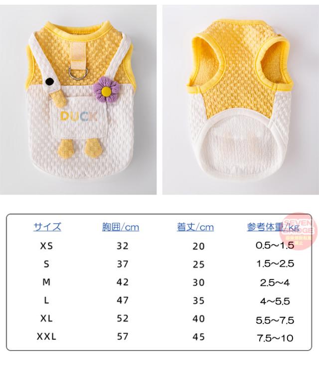 リードが繋げて着てすぐ出かけられる♪ お散歩がもっと楽しくなる快適さとオシャレを兼ね備えたアイテム。 愛らしいアヒルのオーバーオールスタイルが特徴で、どんなペットも目を引く程キュートに変身させます。 薄手で柔らかく通気性が良いので着心地も抜群♪ ペットがリラックスして動けるのが魅力です。 犬でも猫でもサイズさえ合えばご使用可能! ■素材:ポリエステル ■参考サイズ表 XS :胸囲32cm / 着丈20cm / 参考体重:0.5〜1.5kg S :胸囲37cm / 着丈25cm / 参考体重:1.5〜2.5kg M:胸囲42cm / 着丈30cm / 参考体重:2.5〜4kg L:胸囲47cm / 着丈35cm / 参考体重:4〜5.5kg XL:胸囲52cm / 着丈40cm / 参考体重:5.5〜7.5kg XXL:胸囲57cm / 着丈40cm / 参考体重:7.5〜10kg ※掲載サイズはあくまで参考となります事ご了承下さい。 ※リードは付属しておりません。 ※パソコンのモニター設定などにより多少、色の違いが出てくる場合がございます。 【検索ワード】 犬 猫 服 犬の服 猫の服 キャットウェア ドッグウェア 猫の洋服 犬の洋服 男の子 女の子 犬用 大型犬 中型犬 小型犬 ペット服 dog 春 夏 秋 冬 服 ペット用 ドック用品 お散歩アイテム パターン お洒落 オシャレ おしゃれ かわいい 可愛い アヒル タンクトップ |