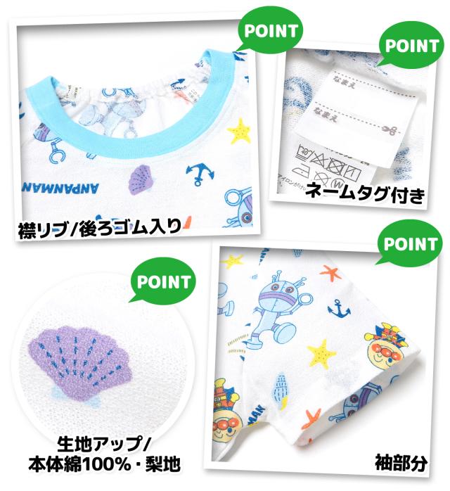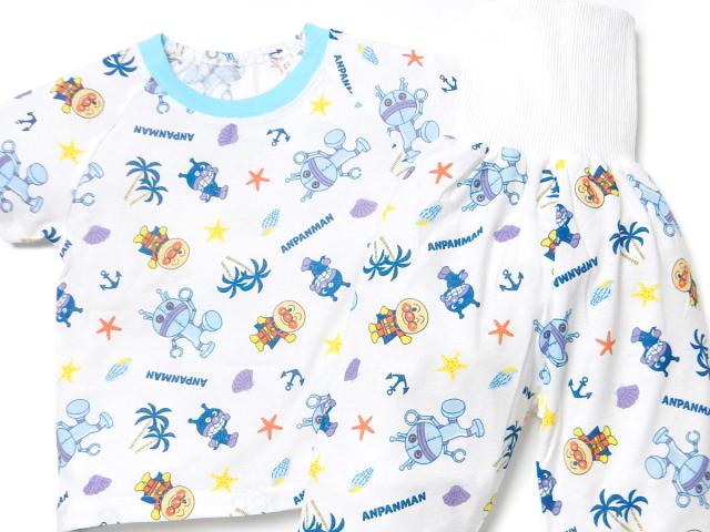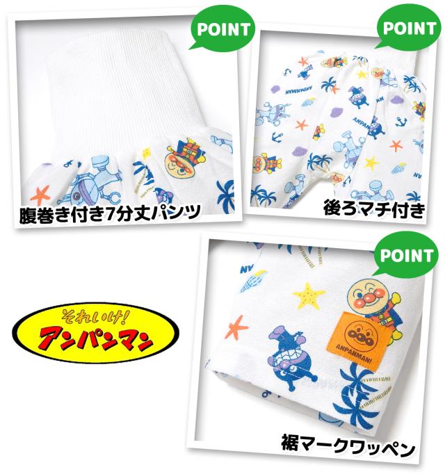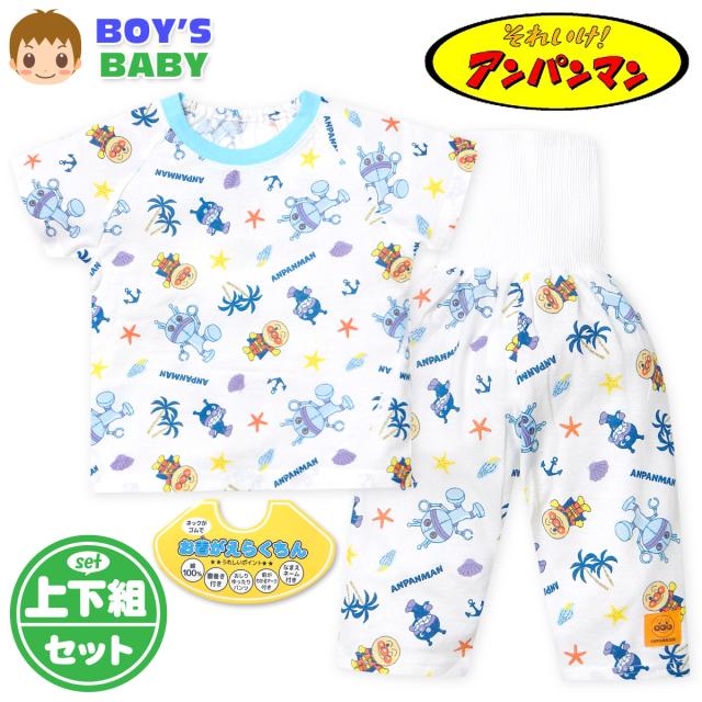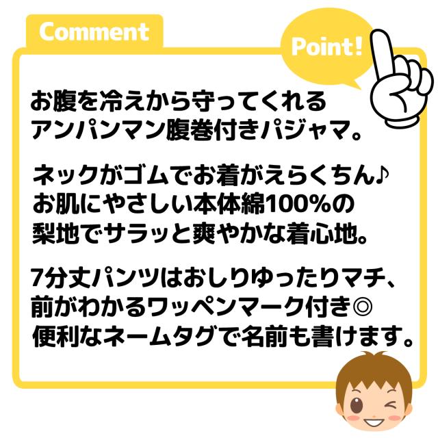 【送料無料】男児 ベビー 腹巻付 半袖 パジャマ アンパンマン 梨地 本体綿100% 上下組 7分丈パンツ ネックがゴムでお着がえらくちん 80cm 90cm 95cm iw-1262【メール便対応】