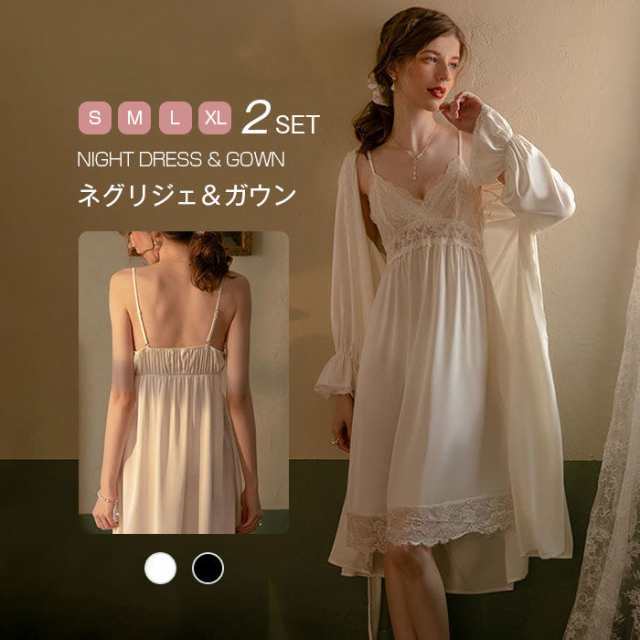 ネグリジェ ワンピース ロング 可愛いネグリジェ ガウン付2点セット ランジェリー キャミソール レース サテン スリップ ドレス ルームウ