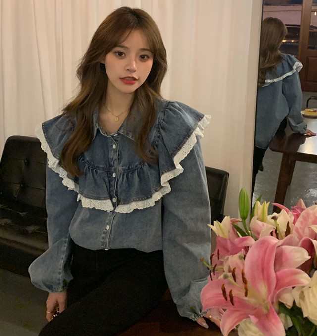 デニムシャツ フリル レディース 長袖 シャツ ブラウス トップス 春 秋 大きいサイズ 3L 4L 春秋 襟付き ラッフルフリル バルーンスリー