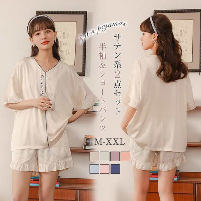 パジャマ ルームウェア 2点セット 半袖 春 夏 サテン生地 レディース サテン パジャマ セットアップ 半袖 無地 ショートパンツ ルームウ