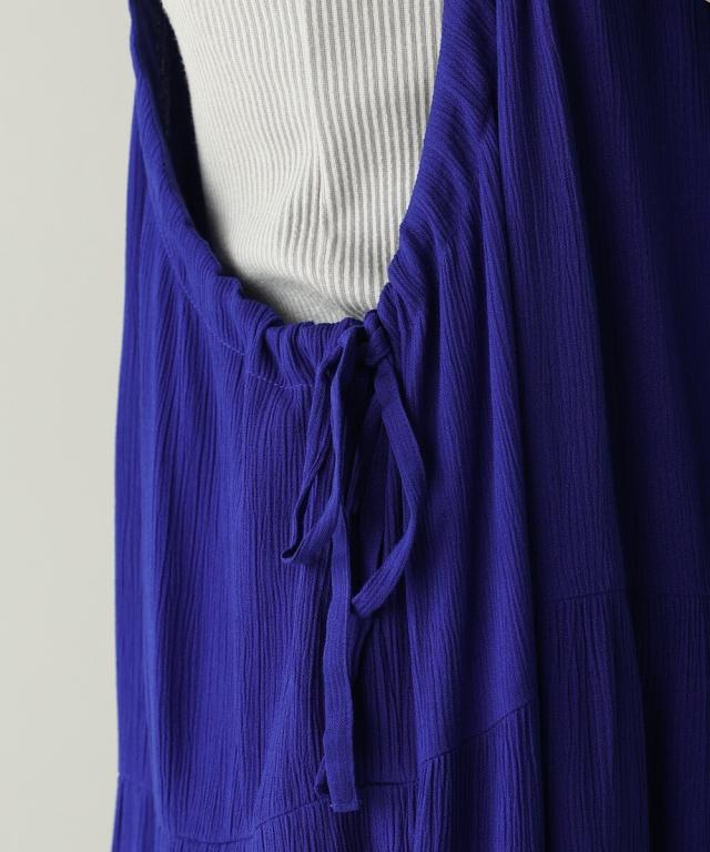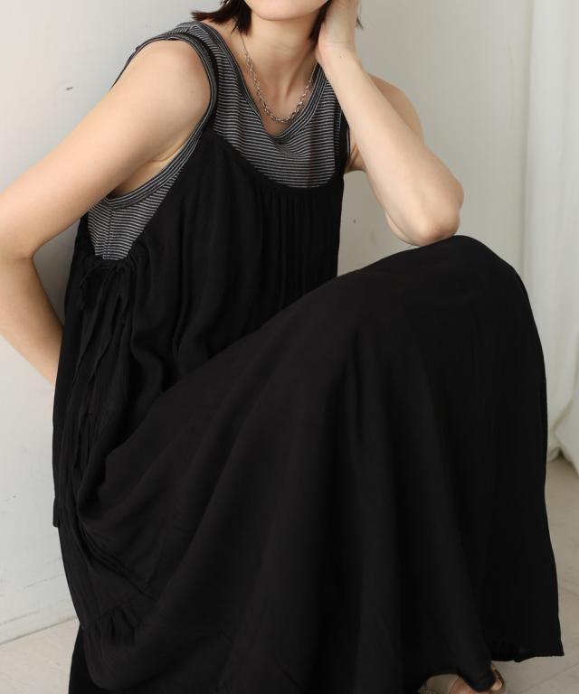 ウエストにたっぷりのギャザーが入ったワンピースは肩紐で着丈の調整ができるので小柄な方から高身長の方まで幅広くお使いいただけます♪BLUE、BROWN、BLACKとそれぞれ雰囲気の異なる色展開なのも魅力の一つです。インナーでカジュアルにもキレイ目にも両方お使いいただけます。