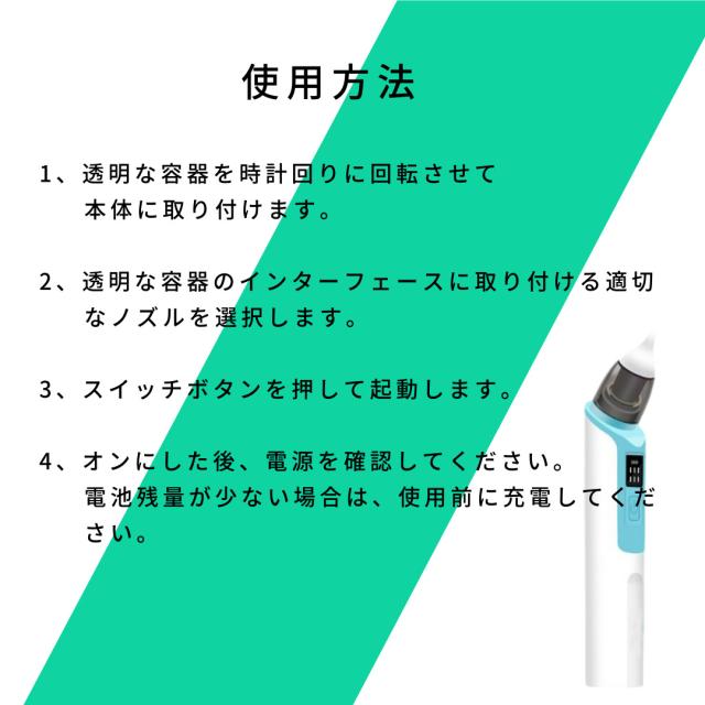 0カ月の乳児から幼児まで使用可能、お子様のお鼻の形や大きさにあわせて2週類のノズルを使い分け!
