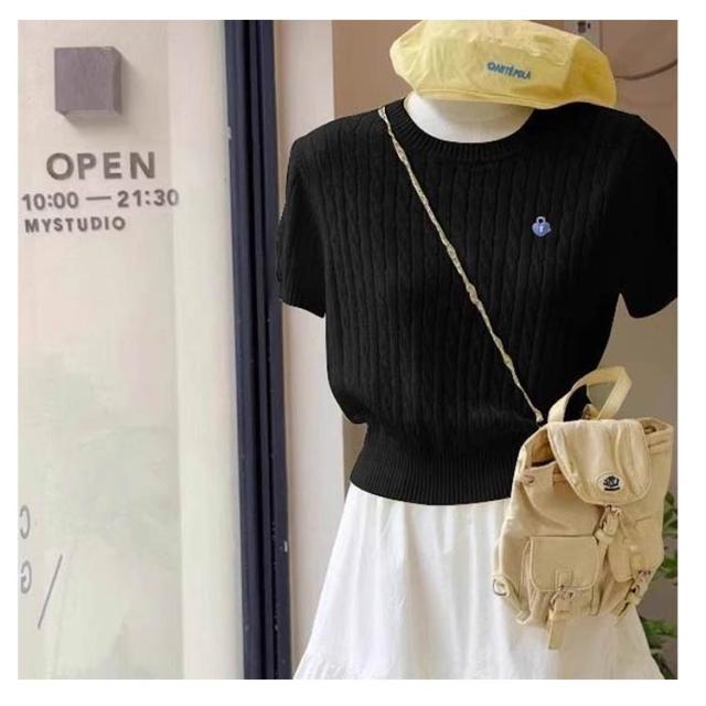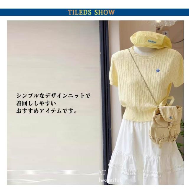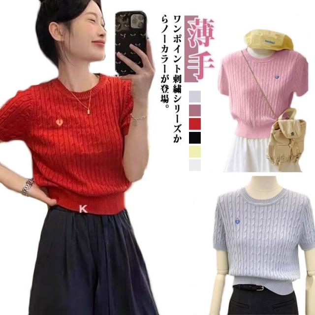 刺繍ケーブルニット レディース 半袖 ショート丈 ペティト向け アイスシルク 夏用 ニッチデザイン 正肩 Tシャツ 薄手 ケーブルニット トップス 半袖 プルオーバー 刺繍 おしゃれ