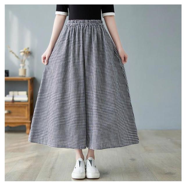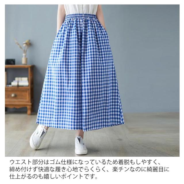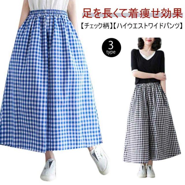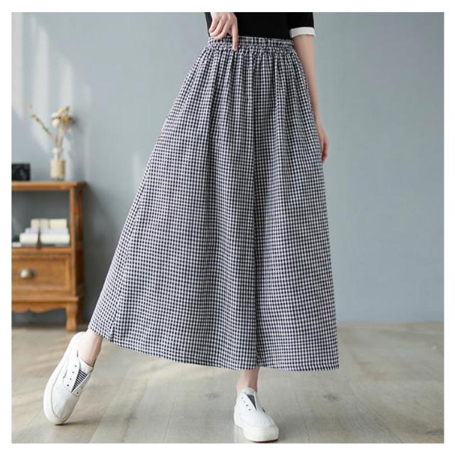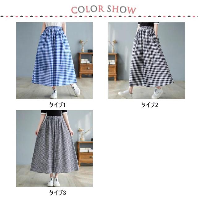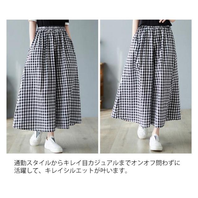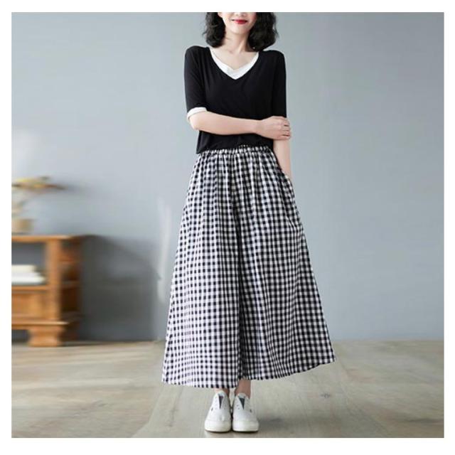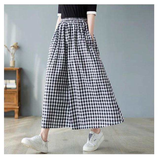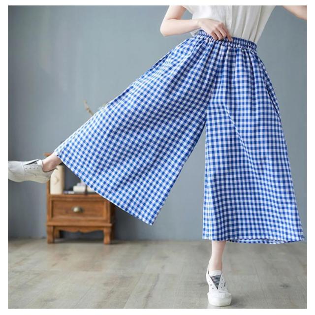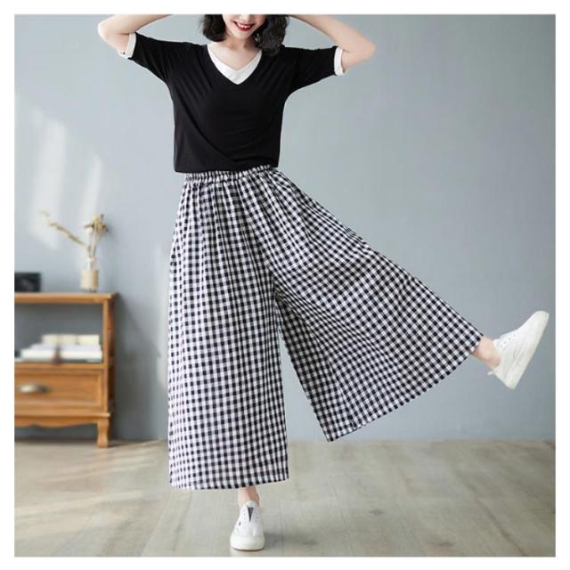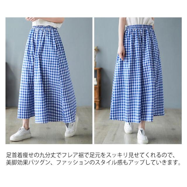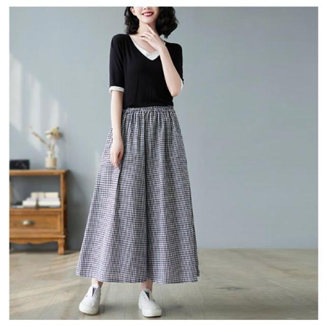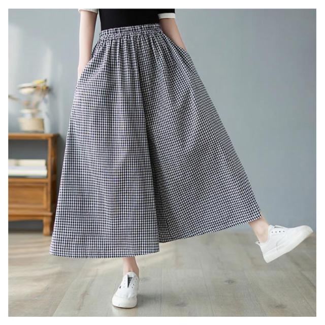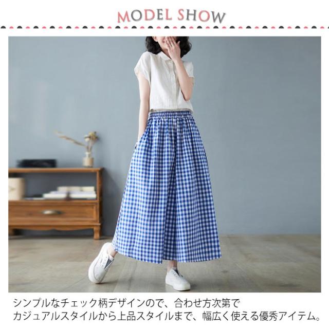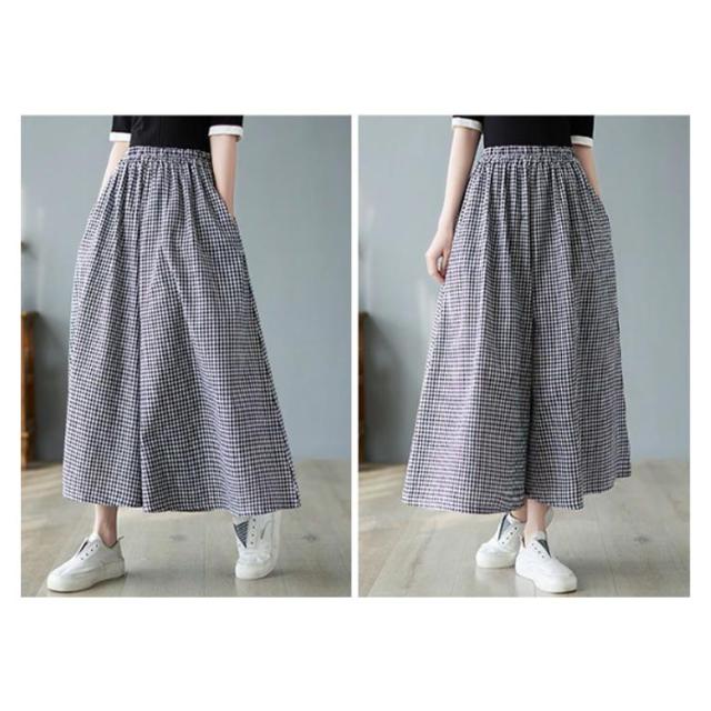 九分丈 リネン風 ウエストゴム チェック柄パンツ レディース ガウチョパンツ スカーチョ ボトムス 春夏 ハイウェスト ワイドパンツ ズボン ワイドパンツ 大きいサイズ カジュアル お洒落 夏服 涼しい