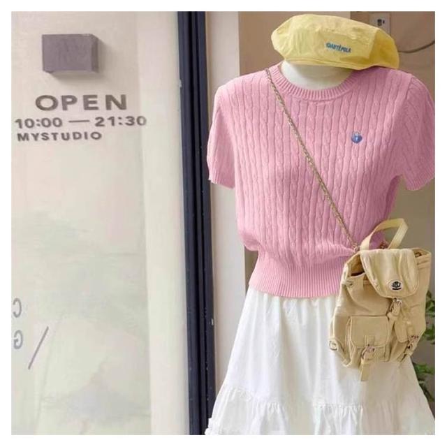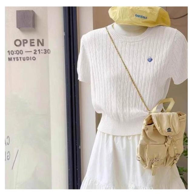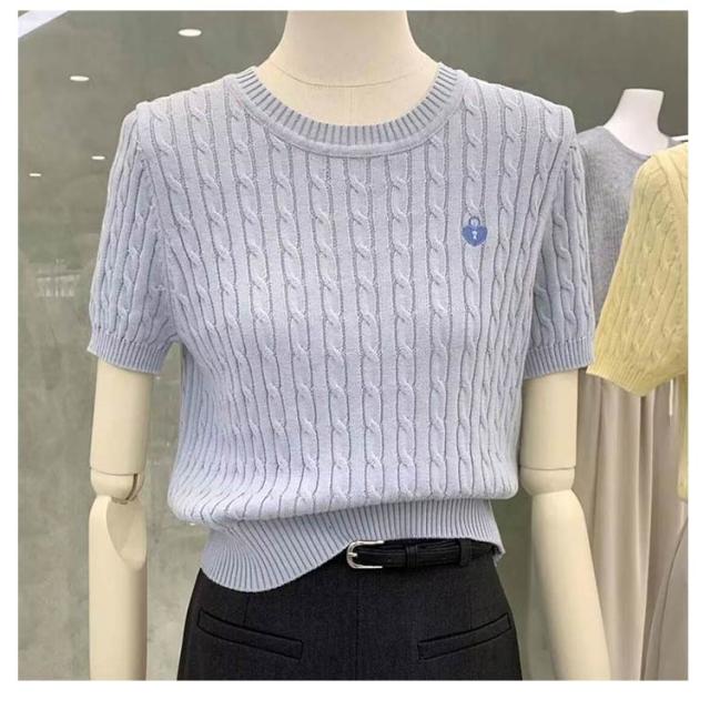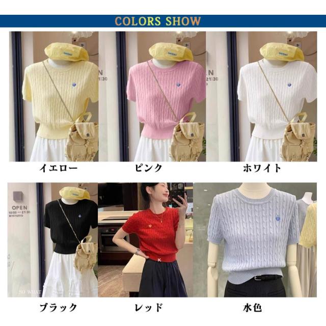 Tシャツ アイスシルク 正肩 刺繍ケーブルニット 半袖 夏用 薄手 レディース ペティト向け ショート丈 ニッチデザイン アイスシルク トップス ケーブルニット プルオーバー 刺繍 おしゃれ
