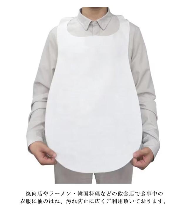 | 頭からかぶるだけで簡単に装着できる使い捨てエプロンです。 耐久性が高く、破れにくいだけでなく、肌に優しい不織布を使用しています。 焼肉店やラーメン・韓国料理などの飲食店で食事中の衣服に油のはね、汚れ防止に広くご利用頂いております。 病院、介護施設でのお食事などの介護にも最適です。 | |