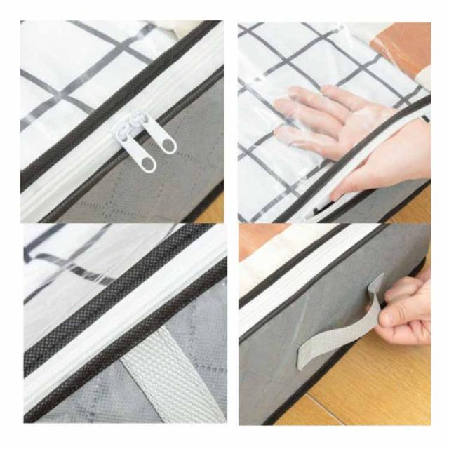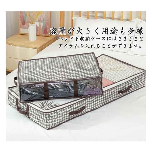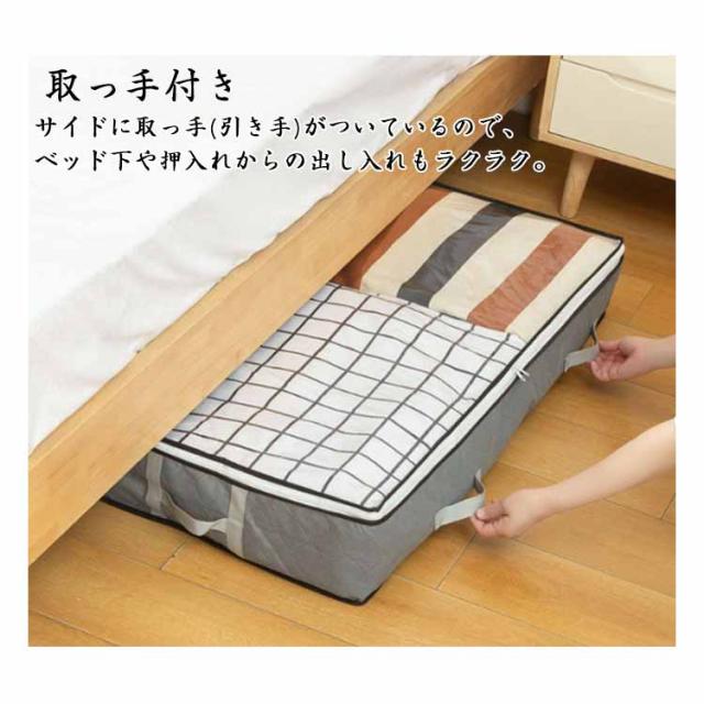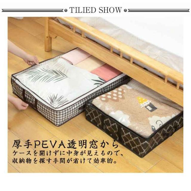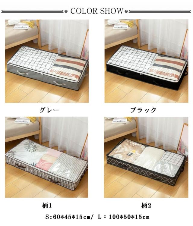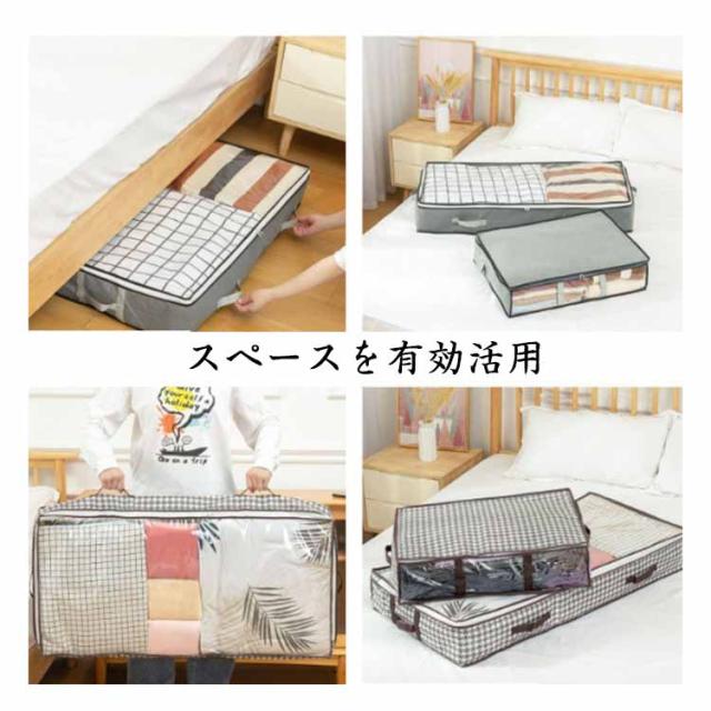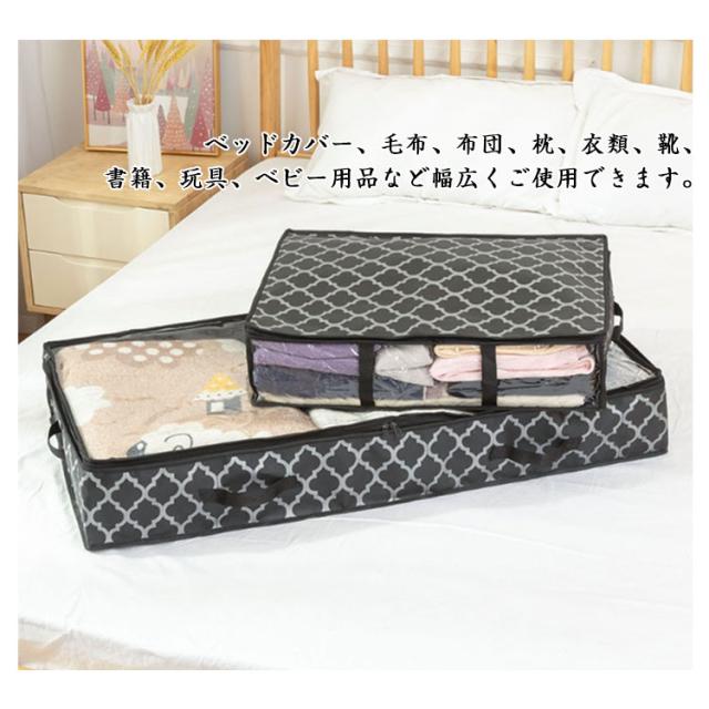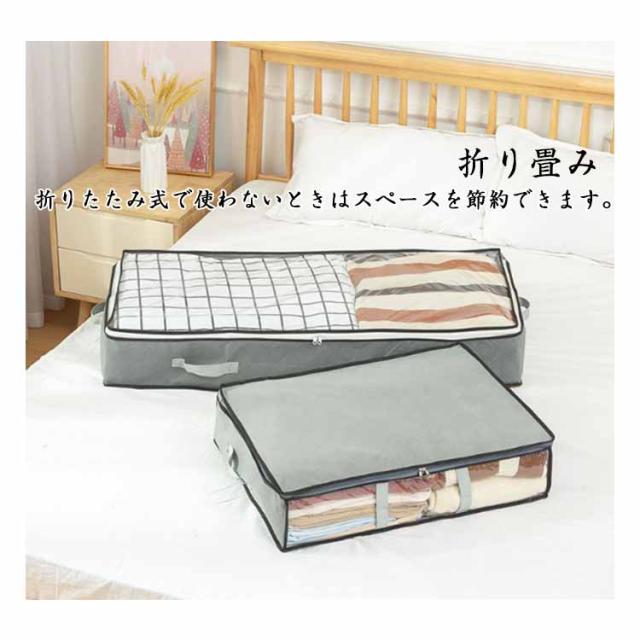 | ●スペースを有効活用 ベッド下のスペース、クローゼットの空きスペース、押入れの隙間などにピッタリな収納ケース。 ●厚手PEVA透明窓から ケースを開けずに中身が見えるので、収納物を探す手間が省けて効率的。 ●取っ手付き サイドに取っ手(引き手)がついているので、ベッド下や押入れからの出し入れもラクラク。 ●折り畳み 折りたたみ式で使わないときはスペースを節約できます。 ●容量が大きく用途も多様 ベッド下収納ケースにはさまざまなアイテムを入れることができます。 ベッドカバー、毛布、布団、枕、衣類、靴、書籍、玩具、ベビー用品など幅広くご使用できます。 | |