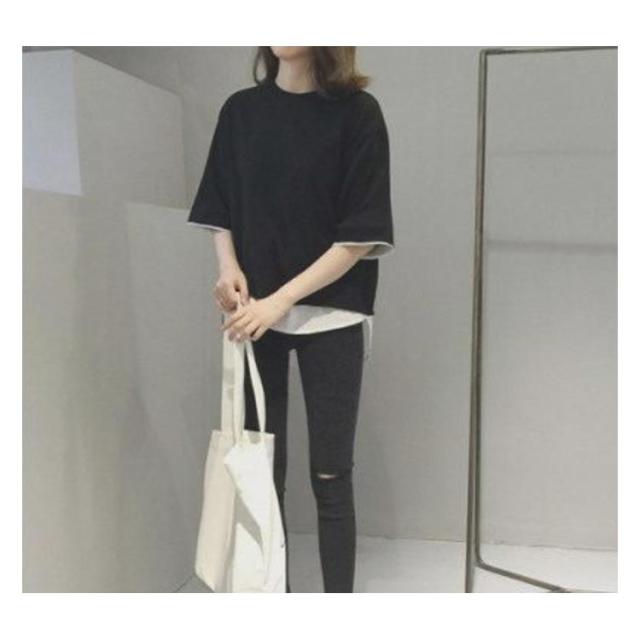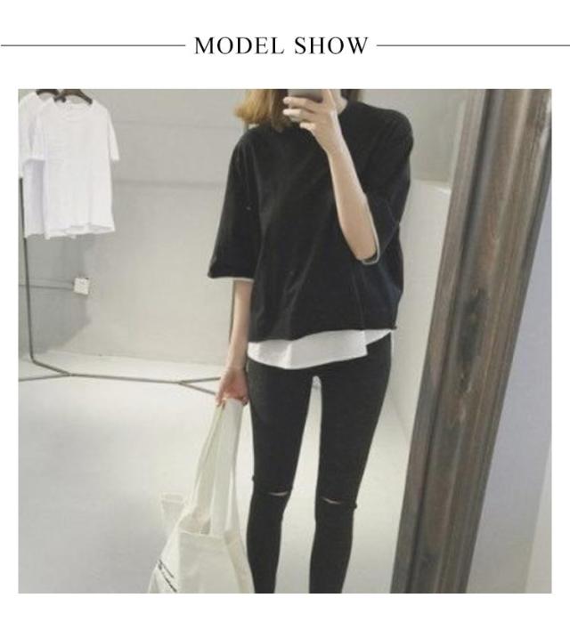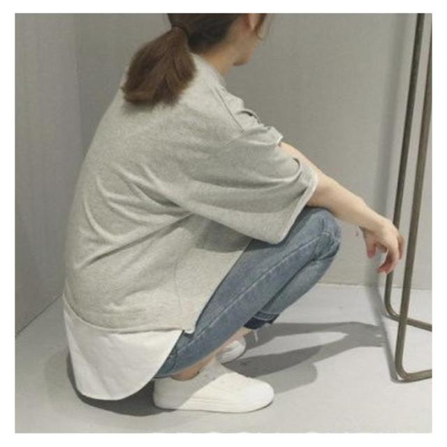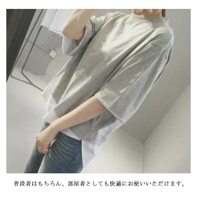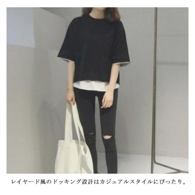 七分袖 重ね着風 カットソー レイヤード トップス Tシャツ レディース ゆったり 5分袖 ラウンドネック 切り替え 可愛い 夏服 大きいサイズ お洒落 カジュアル