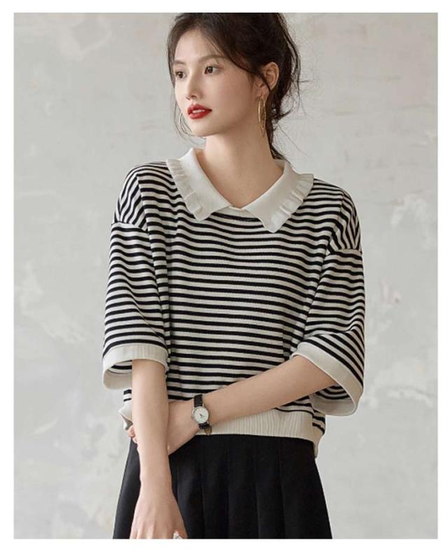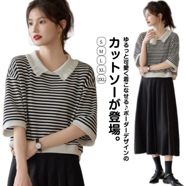 | 襟付きラウンドネックのデザインがポイントのボーダートップス。 コーデを高見えさせる大人っぽいボーダー柄に仕上げました。 ゆったりシルエットながら程よい丈感で大人っぽいスタイリングが決まるアイテムです。 春夏に活躍する半袖仕様。暖かい季節のお出かけやリラックスタイムに快適。 コットンとスパンデックス混合生地を使用し、肌触りもよく伸縮性抜群。長時間の着用でも快適に◎ リラックス感溢れるゆったりめなシルエット♪部屋着としてもおススメ! | |