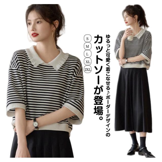 送料無料 ロンT 襟付き ボーダー柄 レディース スウェット チュニック 五分袖 トップス Tシャツ カットソー ポロシャツ ビッグ ゆったり 無地 体型カバー カジュアル 大人可愛い おしゃれ 春 夏