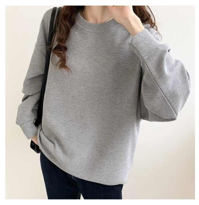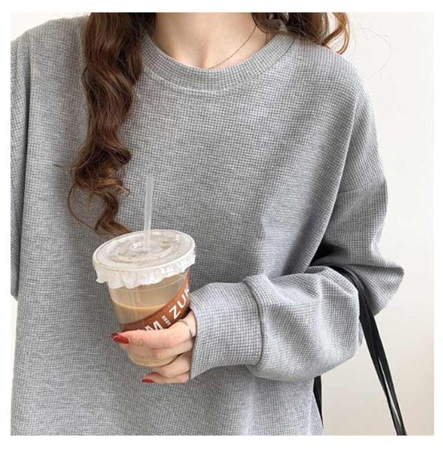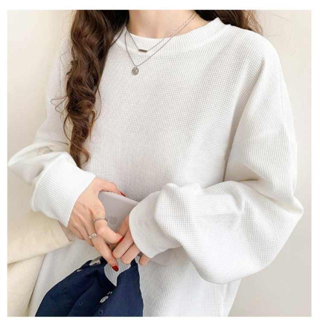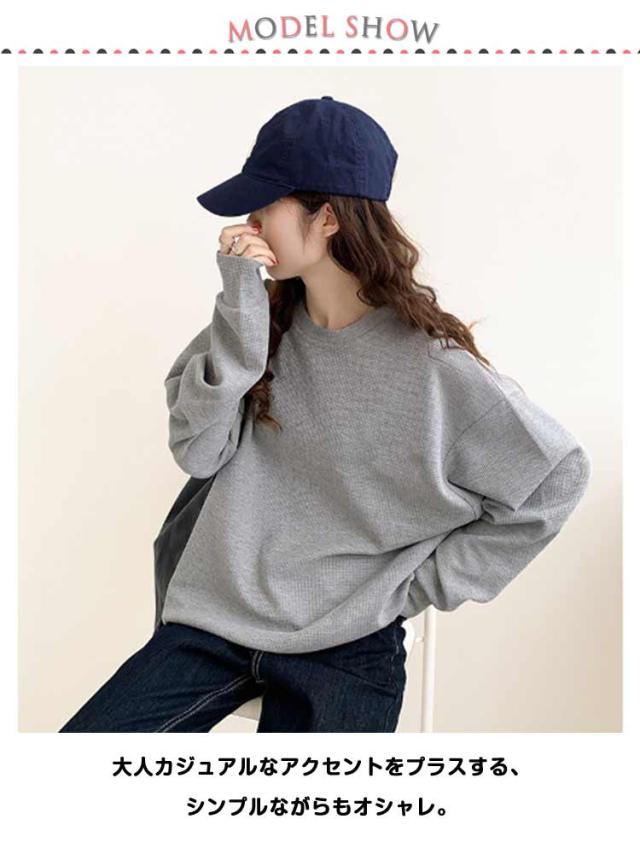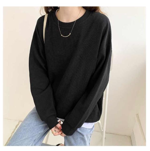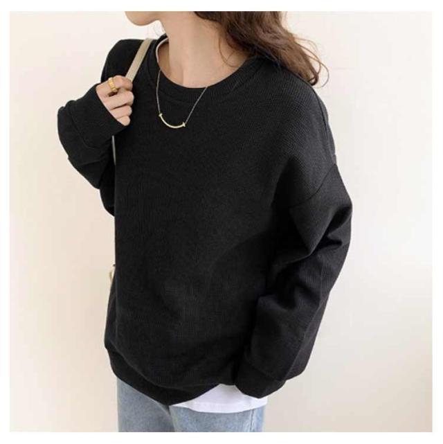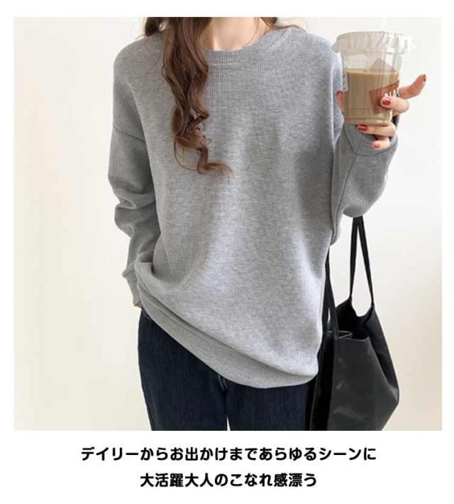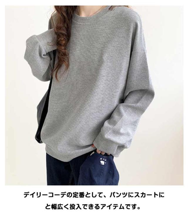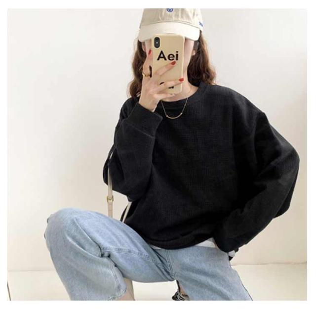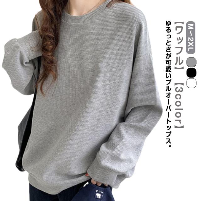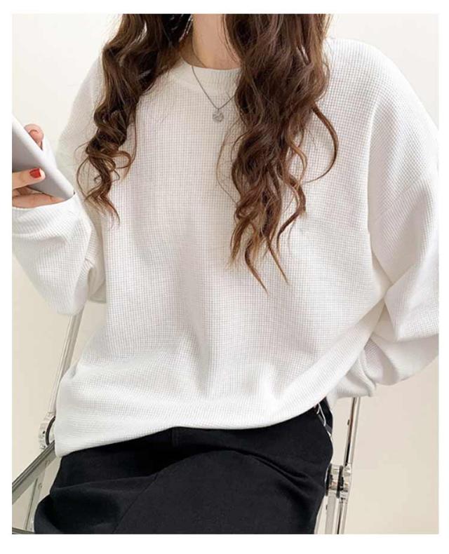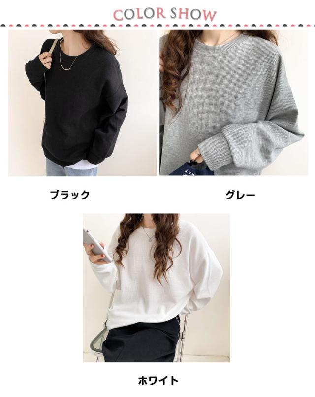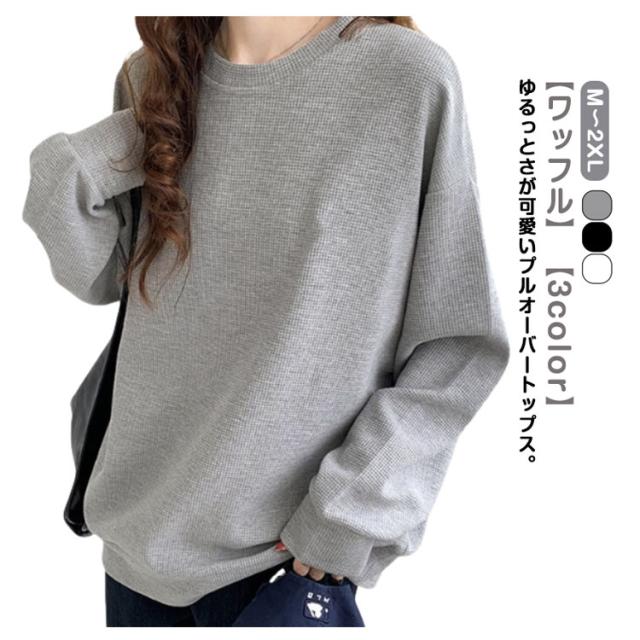 春 ブラック ワッフル ホワイト トレーナー レディース カットソー ゆったり ロンT トップス 秋 体型カバー 大きいサイズ 韓国 長袖 ドロップショルダー 白 黒 グレー ゆるっと ゆるっと スウェット シンプル カジュアル Tシャツ