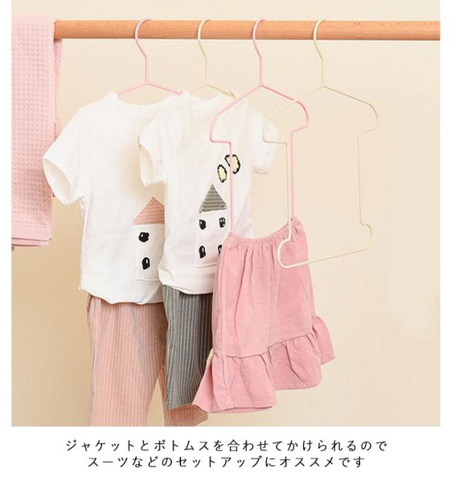 | トップスとボトムスを同時に収納できるセットアップハンガー。【子供用】【5本セット】 Tシャツをモチーフにしたような見た目にもキュートなデザインです。 ジャケットとボトムスを合わせてかけられるのでスーツなどのセットアップにオススメです。 またお気に入りのコーディネートで収納すれば忙しい朝に迷わずさっと選べるので便利です。 収納しやすいワイヤータイプで省スペースです。 | |