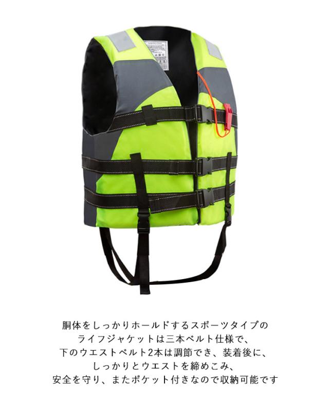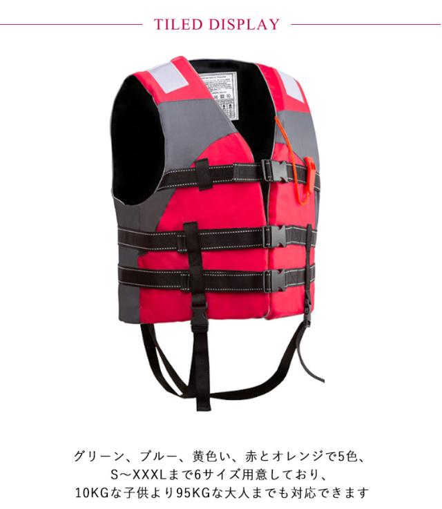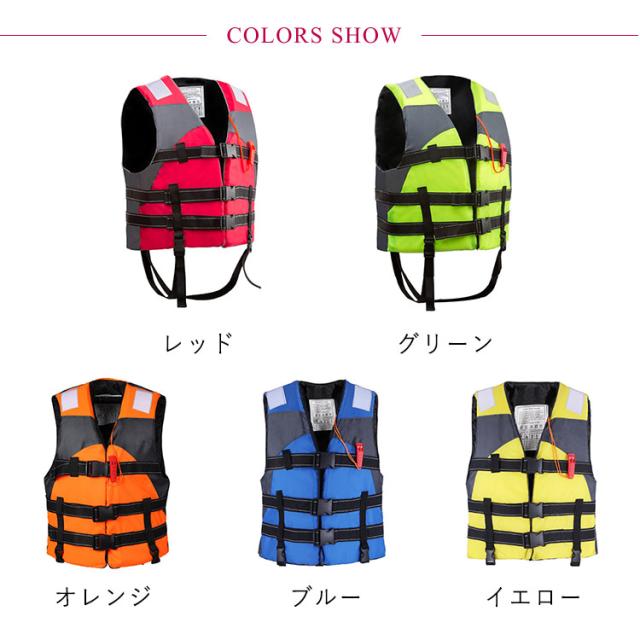 | 釣りや潮干狩り、シュノーケリングなど川遊びや水遊び時にはライフジャケットの着用が安心!【子供用?大人用2サイズ】 胴体をしっかりホールドするスポーツタイプのライフジャケットは三本ベルト仕様で、下のウエストベルト2本は調節でき、装着後に、しっかりとウエストを締めこみ、安全を守り、またポケット付きなので収納可能です。 海や川、湖に出かける機会が多くなる季節に水遊びや魚釣り等に欠かせないアイテムです。笛付きのフローティングベストはアウトドア水遊びやマリンスポーツ、遠く海と沖釣り、水辺のレジャーやカヌー、救命ボートを積載できない小型船舶やプレジャーボート、海事に関係があるなどには欠かせない大事な用具で、使用頻度の高いレジャー施設や事業者さまに最適です。 グリーン、ブルー、黄色い、赤とオレンジで4色、S〜XXXLまで6サイズ用意しており、10KGな子供より95KGな大人までも対応できます。 反射帯付きなので、鮮明的な色を採用して浜辺などの人込みでもひときわ目立ち、姿を見失っても「あそこにいる!」って見つけやすいです。泳ぐことに邪魔にならずに確実に浮力を確保できるデザインです。 | |