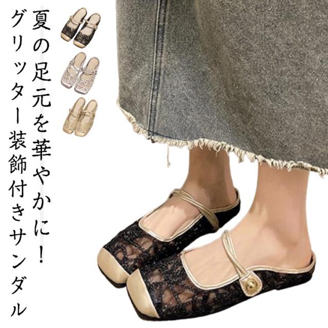 軽量 サンダル フラットシューズ グリッター サンダル 防滑 耐磨 ローヒール シースルー パンプス キラキラ レディース カジュアル チュール 疲れない ぺたんこ シンプル ゴールド シルバー