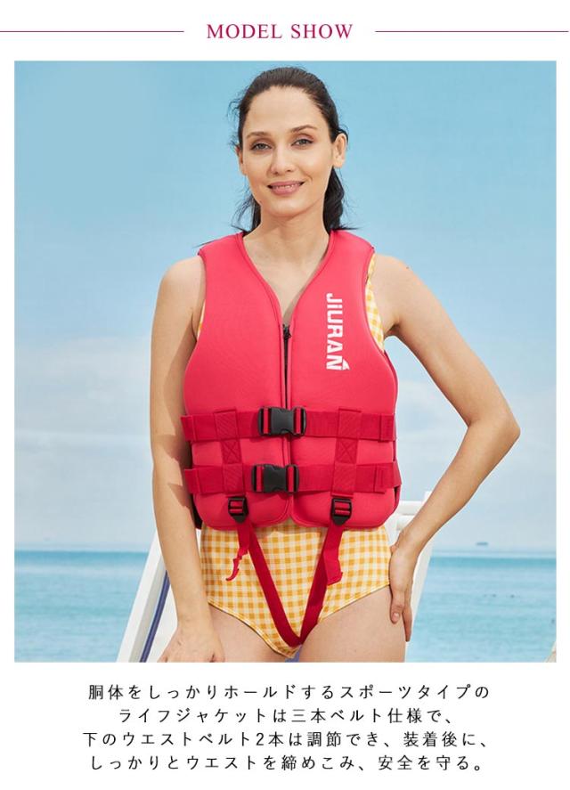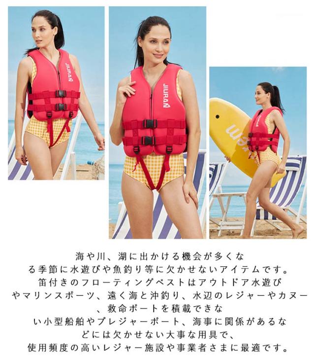 | 釣りや潮干狩り、シュノーケリングなど川遊びや水遊び時にはライフジャケットの着用が安心!【股ベルト付き】【XS-2XL】【男女兼用】 胴体をしっかりホールドするスポーツタイプのライフジャケットは三本ベルト仕様で、下のウエストベルト2本は調節でき、装着後に、しっかりとウエストを締めこみ、安全を守る。 股ベルトは落水時に胴衣が脱げてしまうのを防ぎ、浮遊姿勢を安定させることができます。 海や川、湖に出かける機会が多くなる季節に水遊びや魚釣り等に欠かせないアイテムです。笛付きのフローティングベストはアウトドア水遊びやマリンスポーツ、遠く海と沖釣り、水辺のレジャーやカヌー、救命ボートを積載できない小型船舶やプレジャーボート、海事に関係があるなどには欠かせない大事な用具で、使用頻度の高いレジャー施設や事業者さまに最適です。 | |