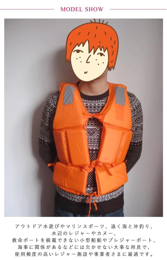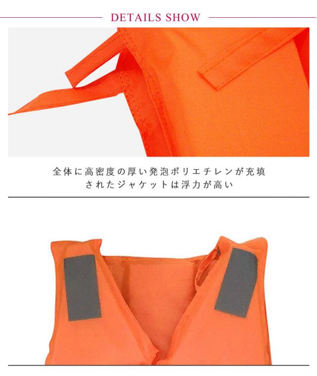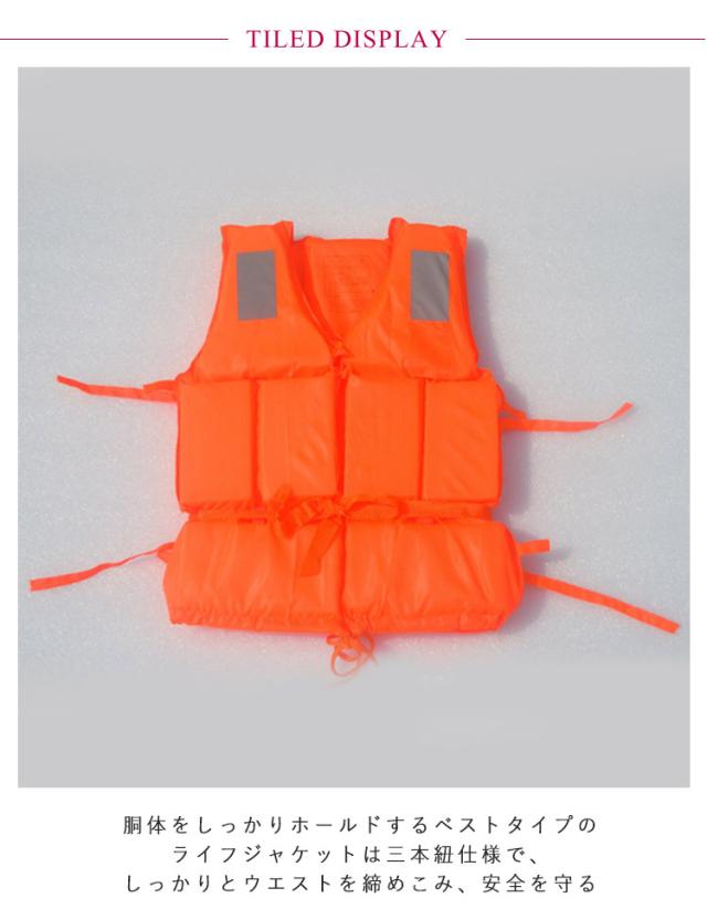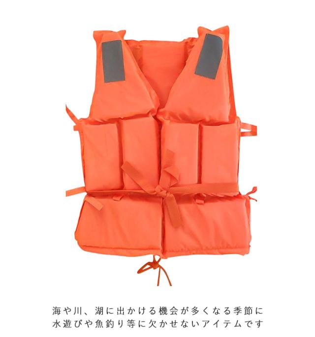 | 川遊びや水遊び時にはライフジャケットの着用が安心!【簡易救命胴衣】 全体に高密度の厚い発泡ポリエチレンが充填されたジャケットは浮力が高い。 胴体をしっかりホールドするベストタイプのライフジャケットは三本紐仕様で、しっかりとウエストを締めこみ、安全を守る。 海や川、湖に出かける機会が多くなる季節に水遊びや魚釣り等に欠かせないアイテムです。 アウトドア水遊びやマリンスポーツ、遠く海と沖釣り、水辺のレジャーやカヌー、救命ボートを積載できない小型船舶やプレジャーボート、海事に関係があるなどには欠かせない大事な用具で、使用頻度の高いレジャー施設や事業者さまに最適です。 | |