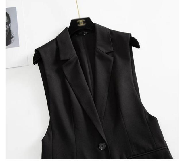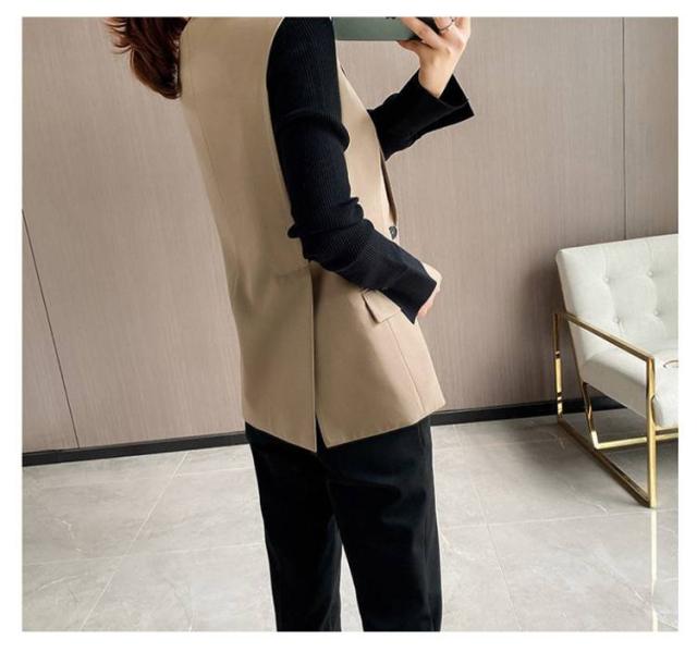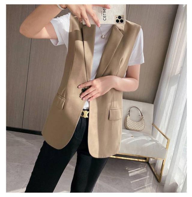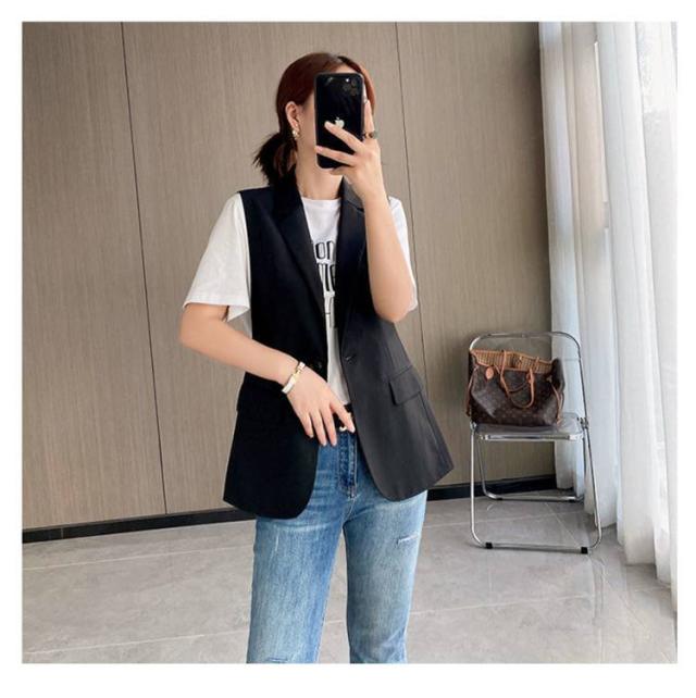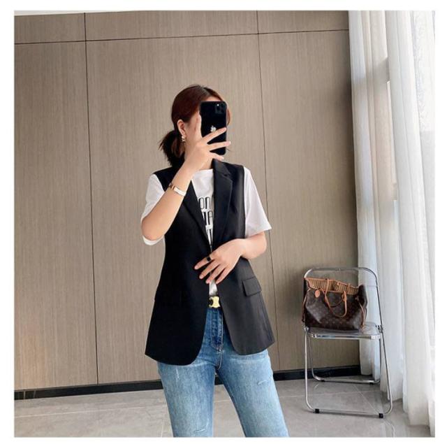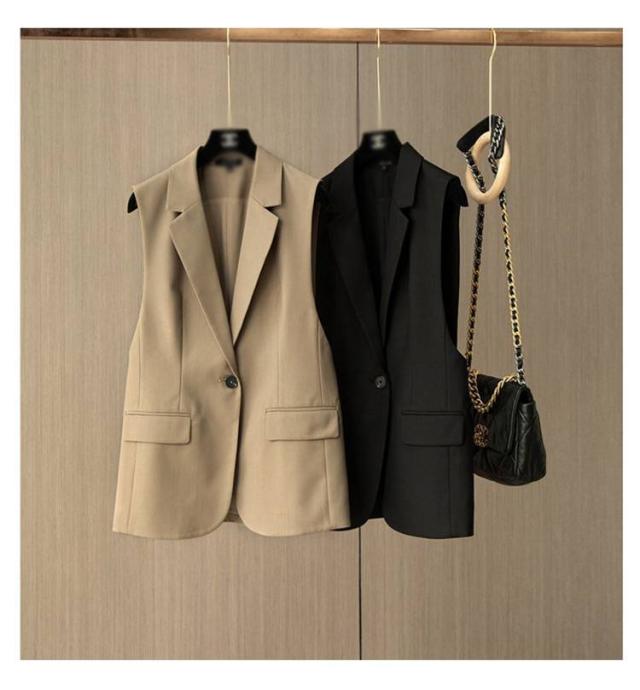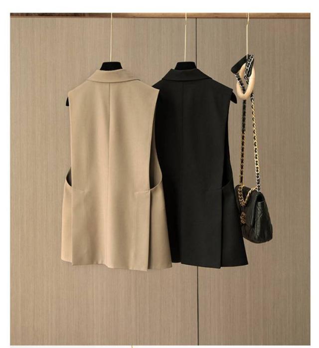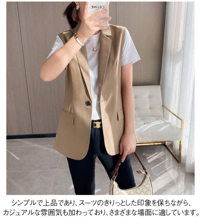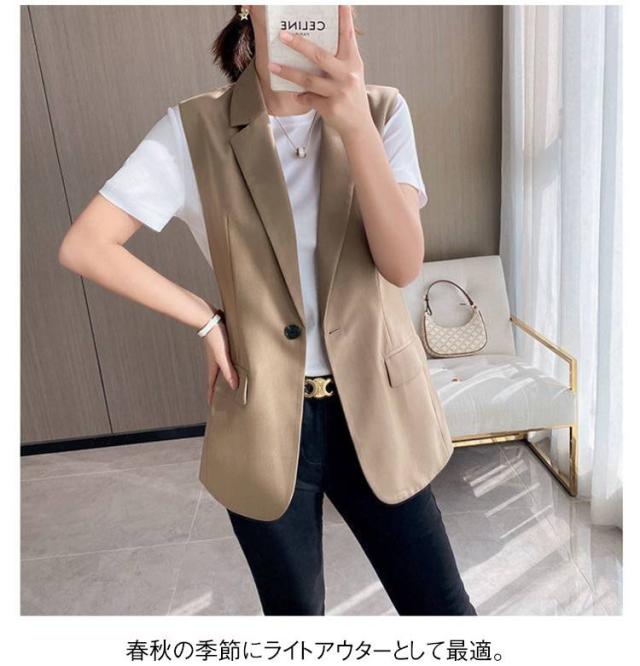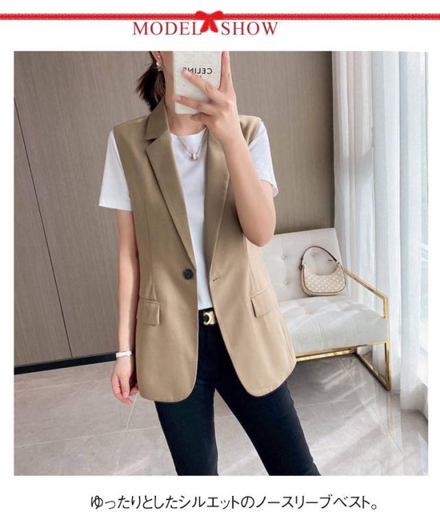 | ゆったりとしたシルエットのノースリーブベスト。 春秋の季節にライトアウターとして最適。 シンプルで上品であり、スーツのきりっとした印象を保ちながら、カジュアルな雰囲気も加わっており、さまざまな場面に適しています。 | |