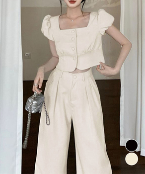半袖のスクエアネックトップスとタック入りのロングパンツがセットになった、おしゃれな上下2点セットアップ