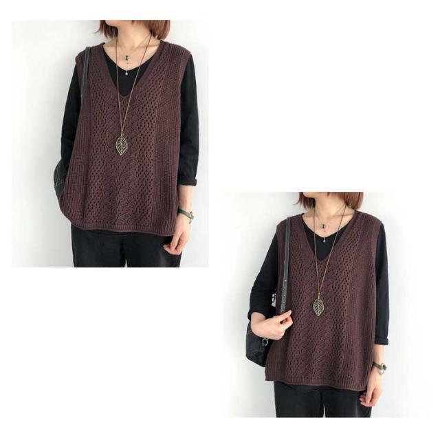 | 透かし編みデザインのニットベストが無地なカットソーと相性が良いです。 深めのVネックに程よいゆとりのあるシルエットのベスト。 カジュアル 肌さわりが良いのニット生地で、一日中ストレスフリー着こなせる。 シンプルなのに、無地のインナーと重ね着するな簡単にお洒落なコーデを完成! | |
