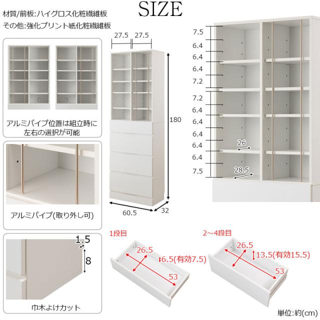 | サイズ | 本体:(約)幅60.5×奥行32×高さ180cm オープン部内寸:(約)幅(左右)27.5×奥行28.5(棚板26)×高さ(上)33.5(下)46.5cm 引出し内寸/(約)幅53×奥行26.5×深さ(浅)6.5(有効7.5)・(深)13.5(有効15.5)cm 巾木よけ/(約)8×1.5cm 棚板/可動式:6枚(6.4cmピッチ・上:4段階・下:6段階)、固定式:2枚 ※組立時の固定棚の位置選択で上下の棚ピッチ数は反転します。 耐荷重量/棚板:(約)5kg 商品重量/(約)46kg |