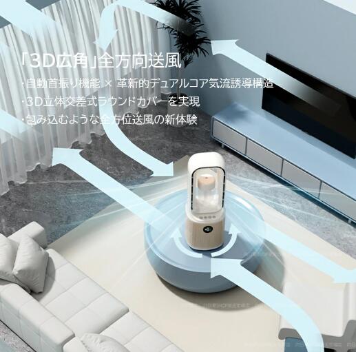 <3D広角送風>: 環抱式の3D広角送風技術により、部屋全体を効率的に涼しくし、新しい送風体験を提供します。