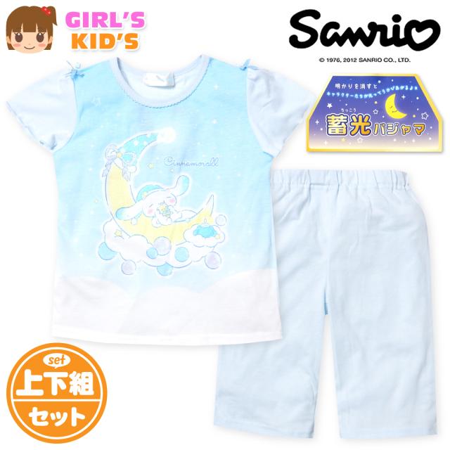 【送料無料】女児 キッズ 天竺 半袖 光るパジャマ Sanrio サンリオ シナモロール ハーフパンツ 上下組 蓄光 ラメ リボン 子供服 女の子 100cm 110cm 120cm 130cm td-0912【メール便対応】