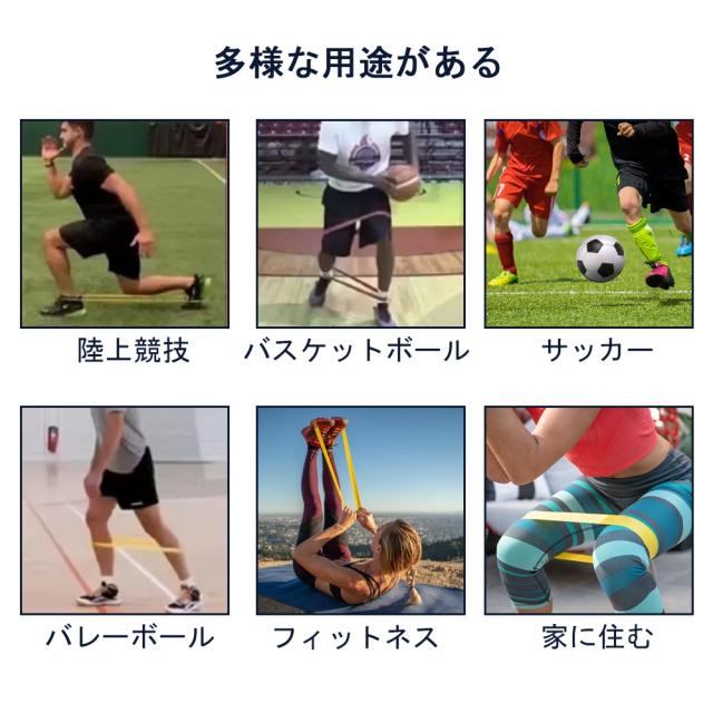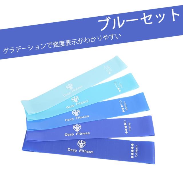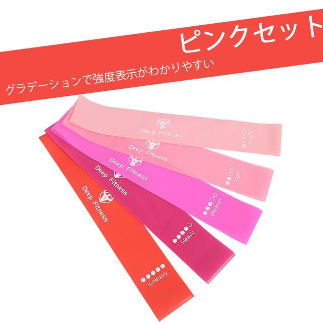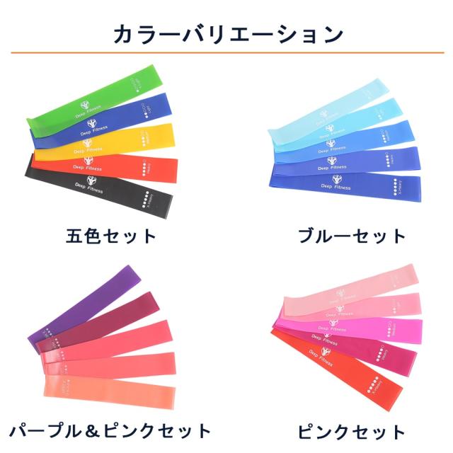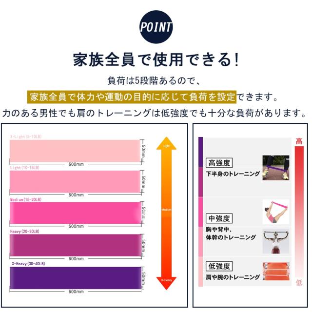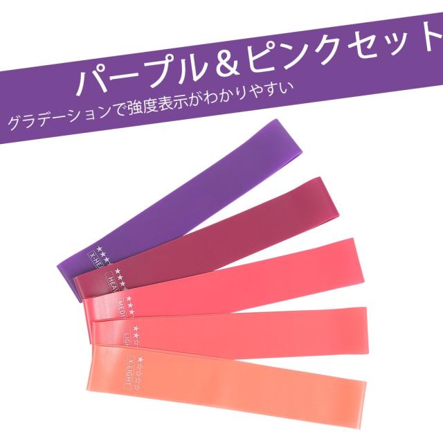 【強度レベル5色セット】5色のエクササイズバンドはそれぞれの強度レベルも違います。身体の箇所や体調によって自由自在なトレーニングや筋力アップが可能です。